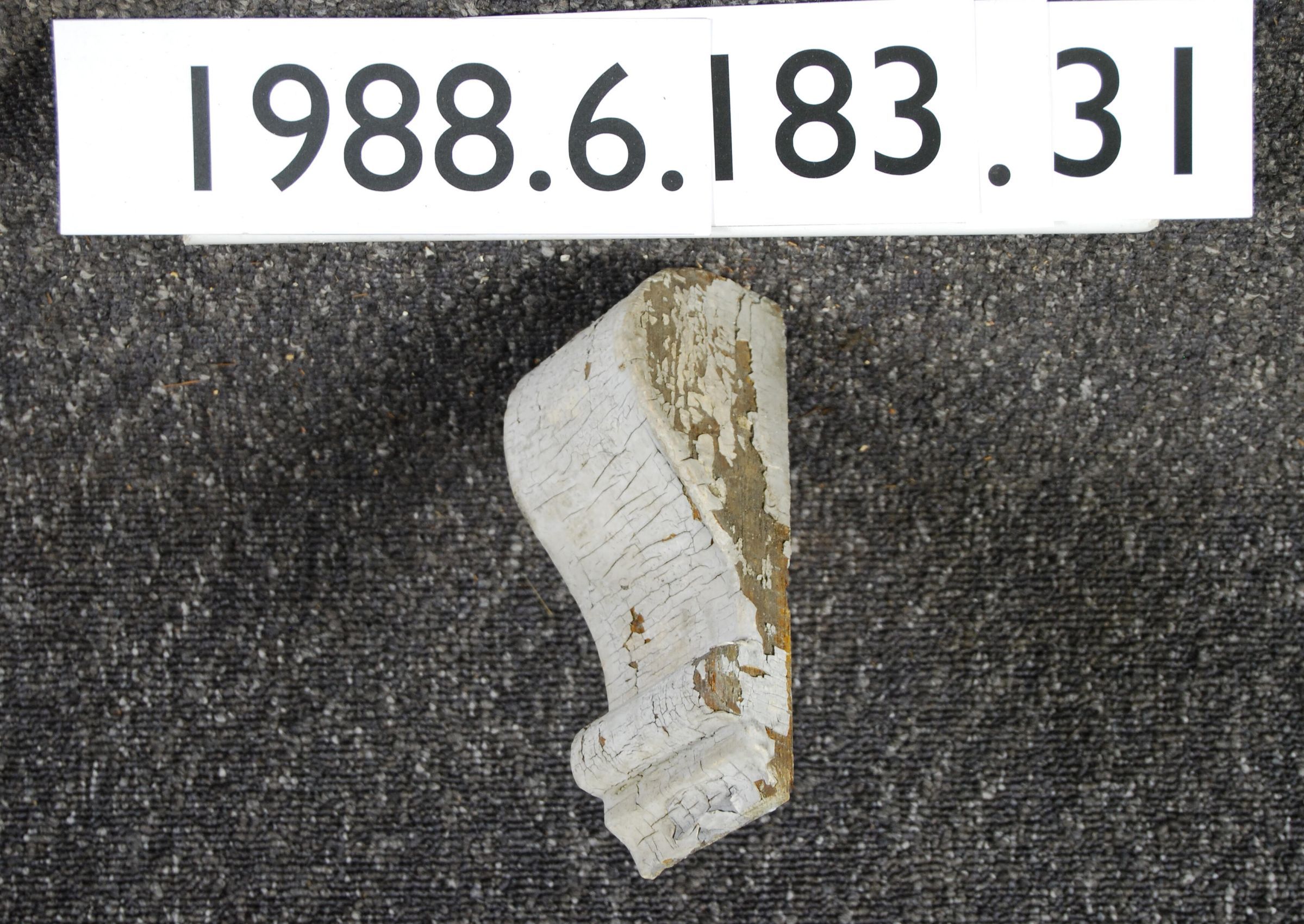 Exterior wood bracket. compound contour. Cut from single block. Painted grey. Inscriptions or Markings: Manufacturer: Place of Manufacturer: Design motif: Style: Finish: Painted