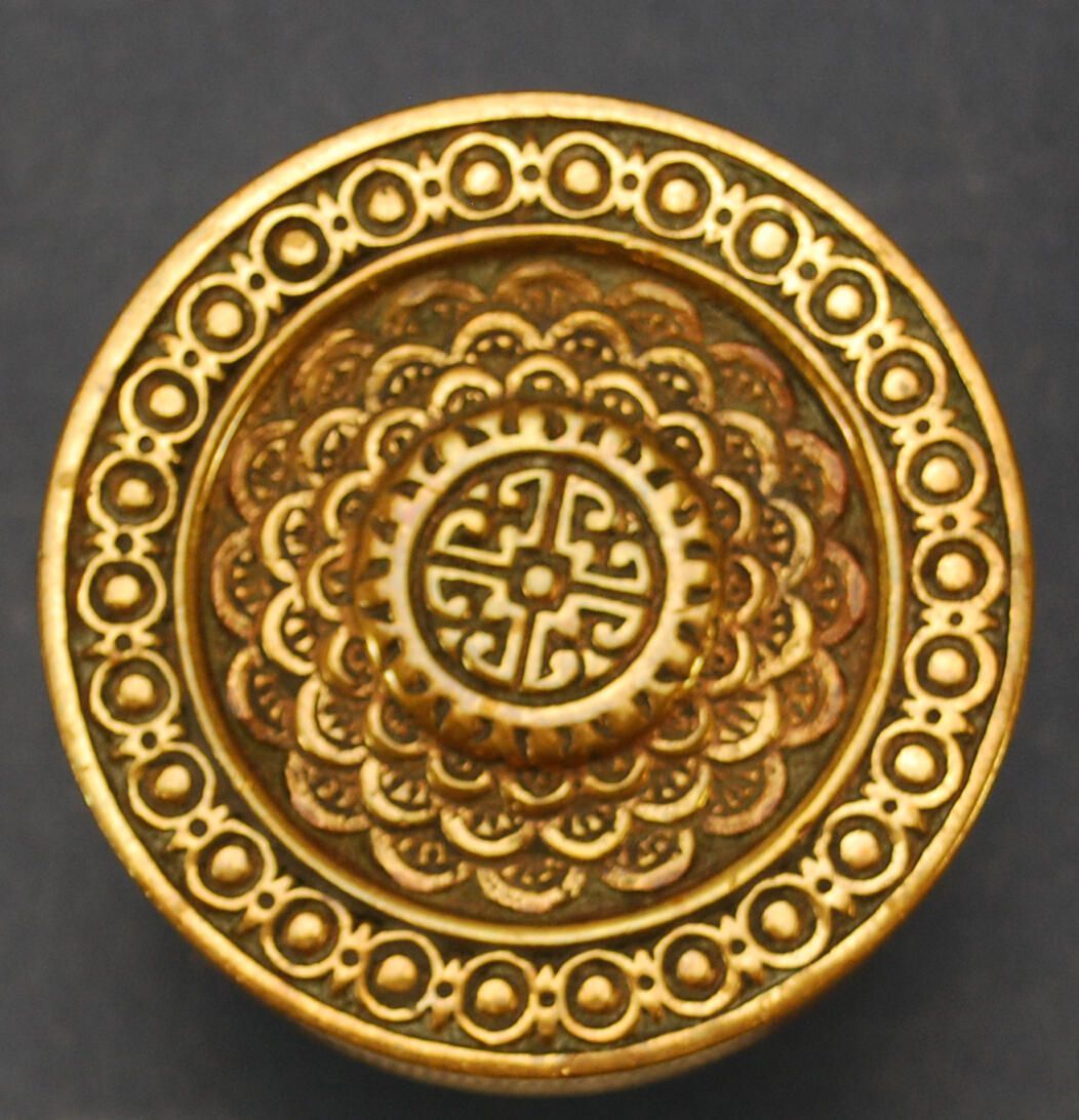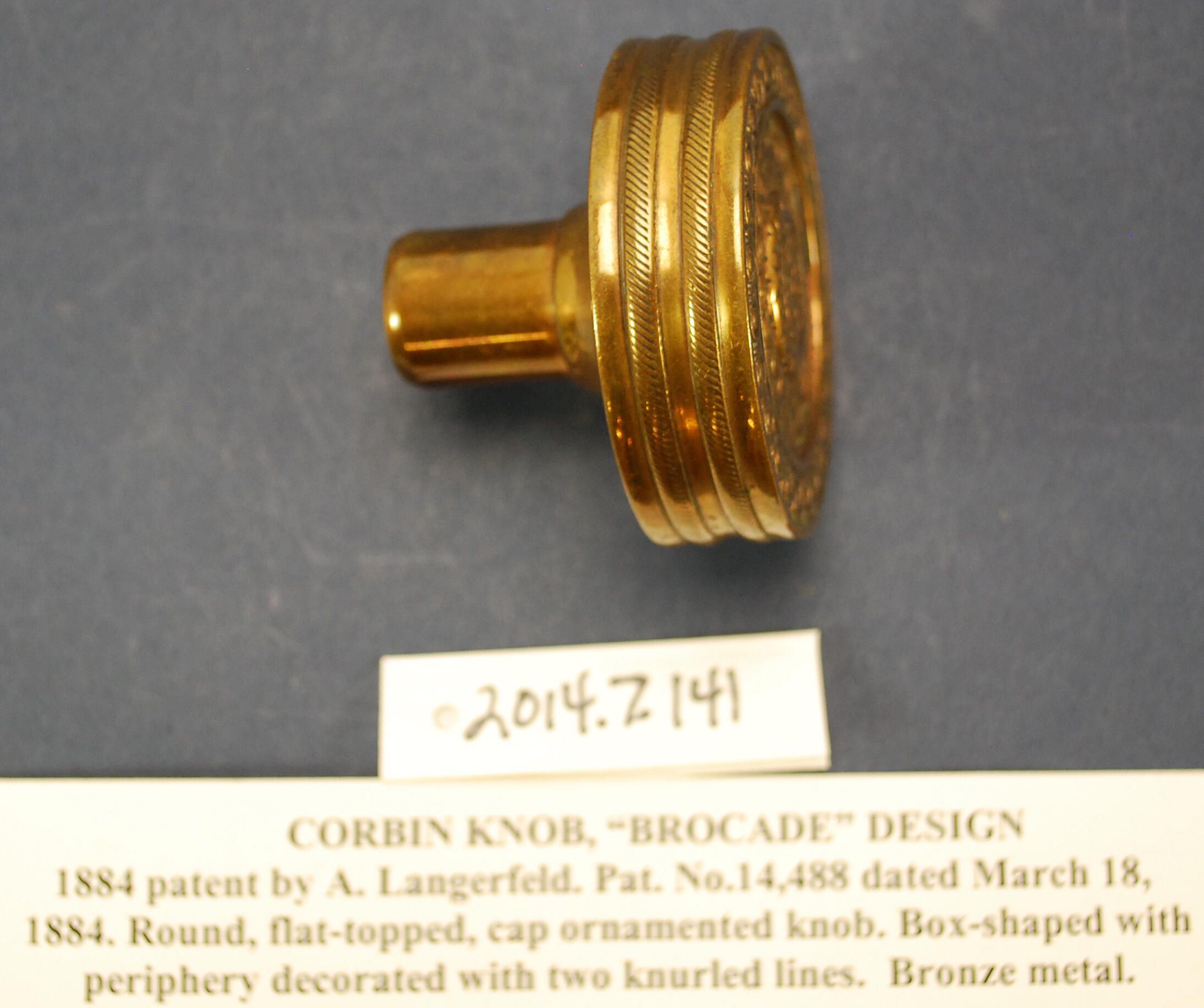 Design Name: Brocade Manufacturer: P&F Corbin Style: Aesthetic Material: Bronze Manufacturing Method: Cast Surface Finish: Polished VDA Classification: Field & Diaper VDA Number: D-101 Shape: Drum Patent Specifics: 14,488 March 18, 1884 D. Langerfeld Lock Type (If Applicable): Inscription/Makers Mark: Inscription Text: Comments: Dropped by 1905