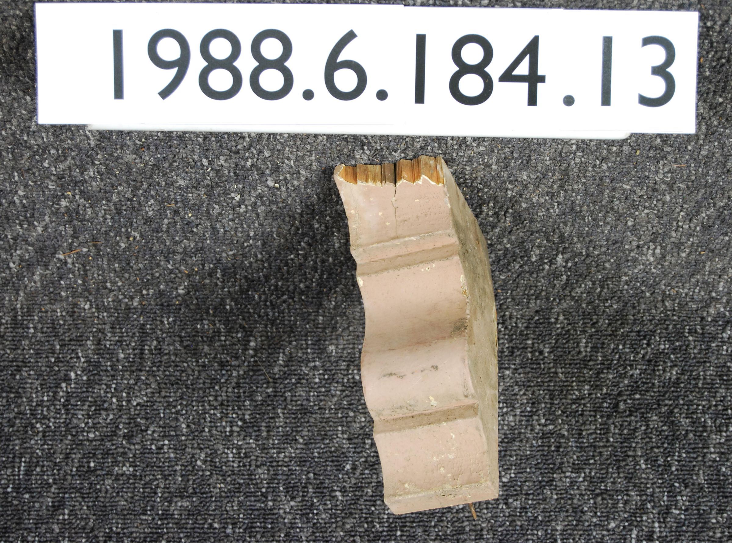Exterior wood bracket. compound contour. Cut from single block. Painted pink. Inscriptions or Markings: Manufacturer: Place of Manufacturer: Design motif: Style: Finish: Painted
