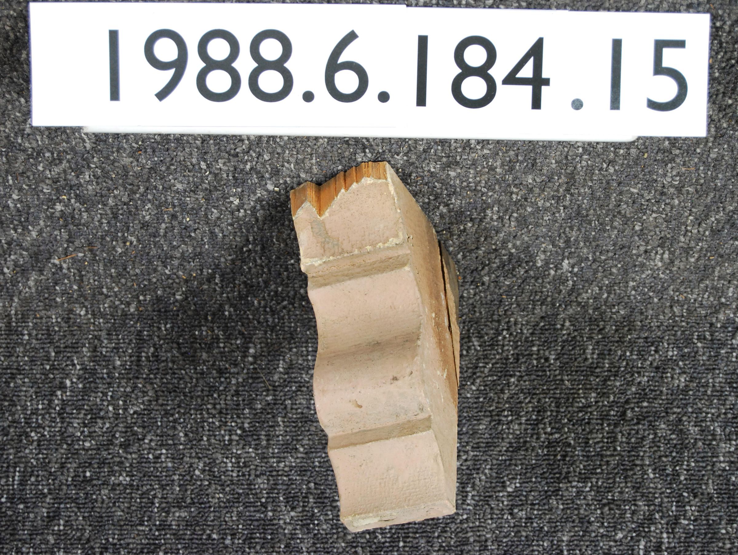 Exterior wood bracket. compound contour. Cut from single block. Painted pink. Inscriptions or Markings: Manufacturer: Place of Manufacturer: Design motif: Style: Finish: Painted
