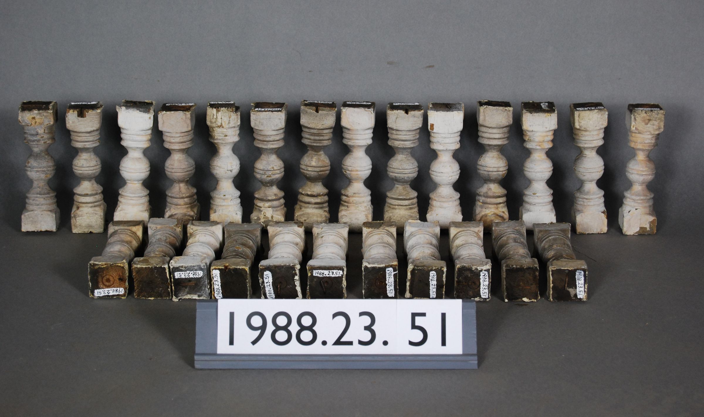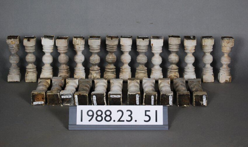 Exterior wood. One lot of twenty-five turned spindles. Painted grey/beige. Manufacturer: Place of Manufacturer: Design motif: Style: Finish: Painted