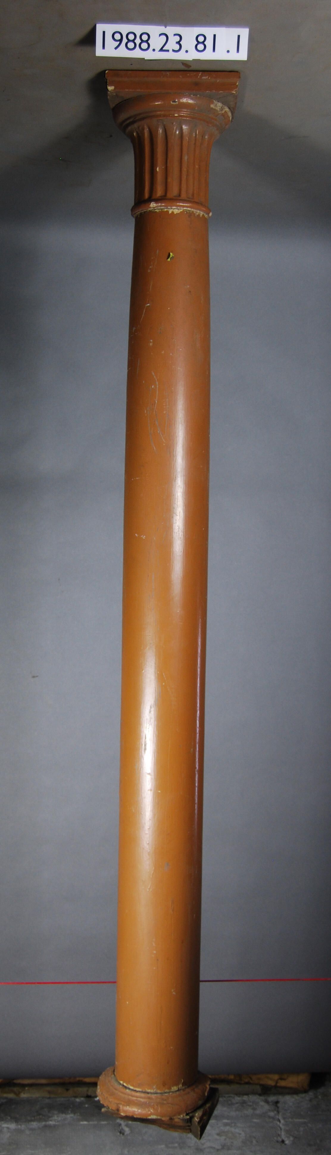 Exterior wood classical revival column composed of: semi-circular base with broken and incomplete blocks below. Hollow semi-cylindrical shank. Capital with fluting around drum. Rectangular abacus. Painted brown.