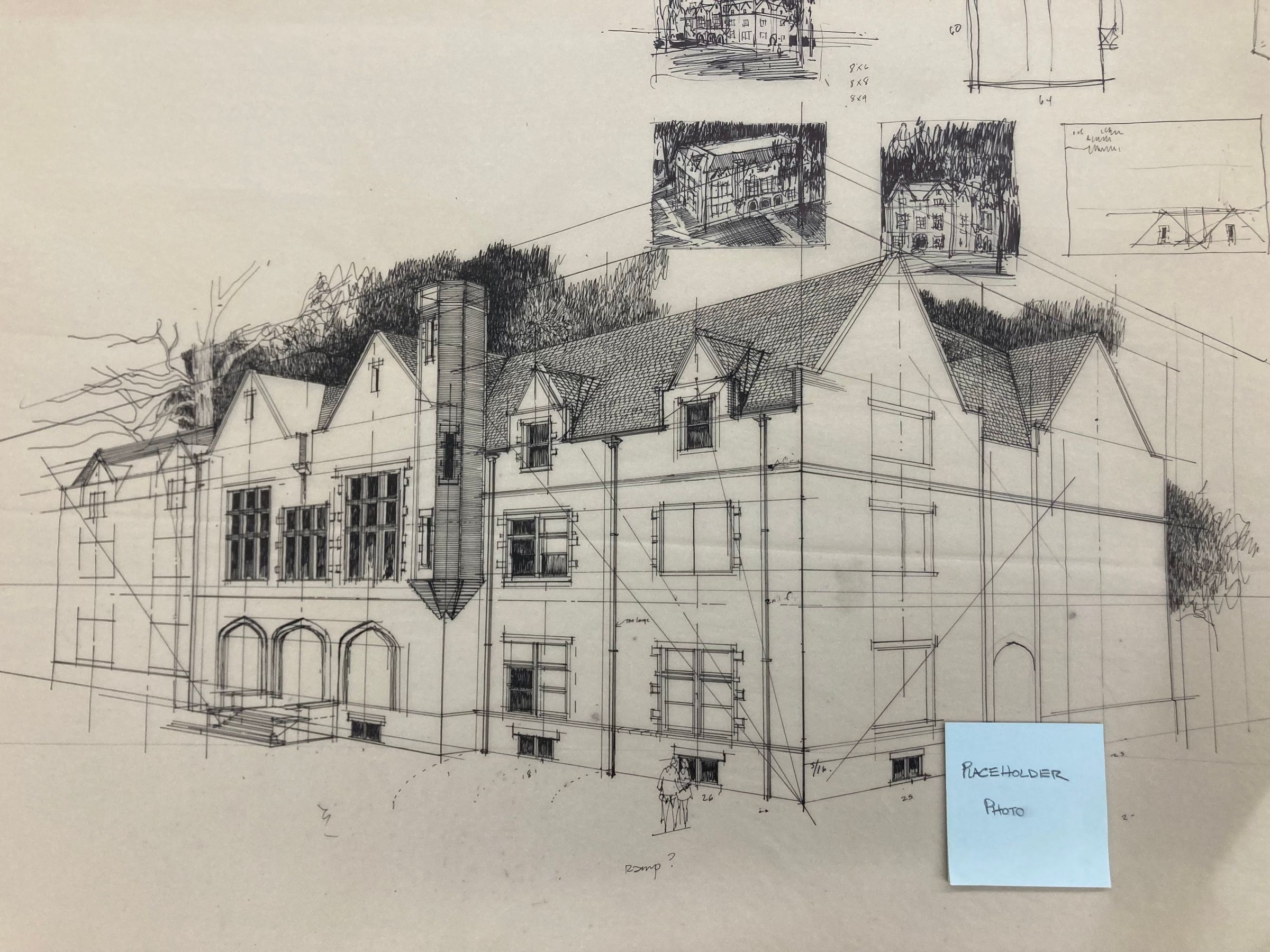 Project description: Restoration of an academic building featuring Tudor arch entry and rusticated window jambs
