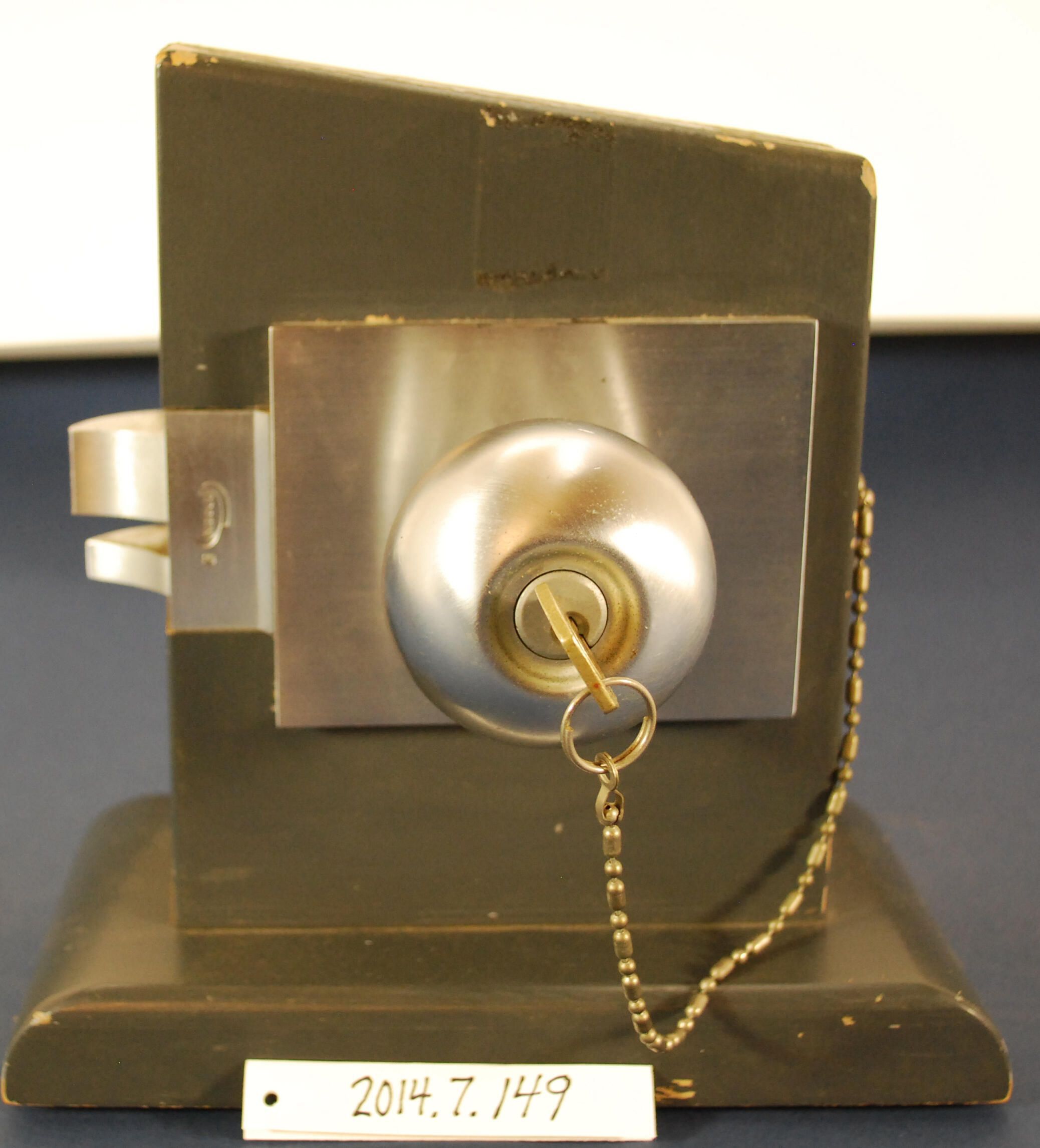 Comments: (Clarence Westman gift) Mounted on block includes two keys but no keeper; salesman's sample unit lock.