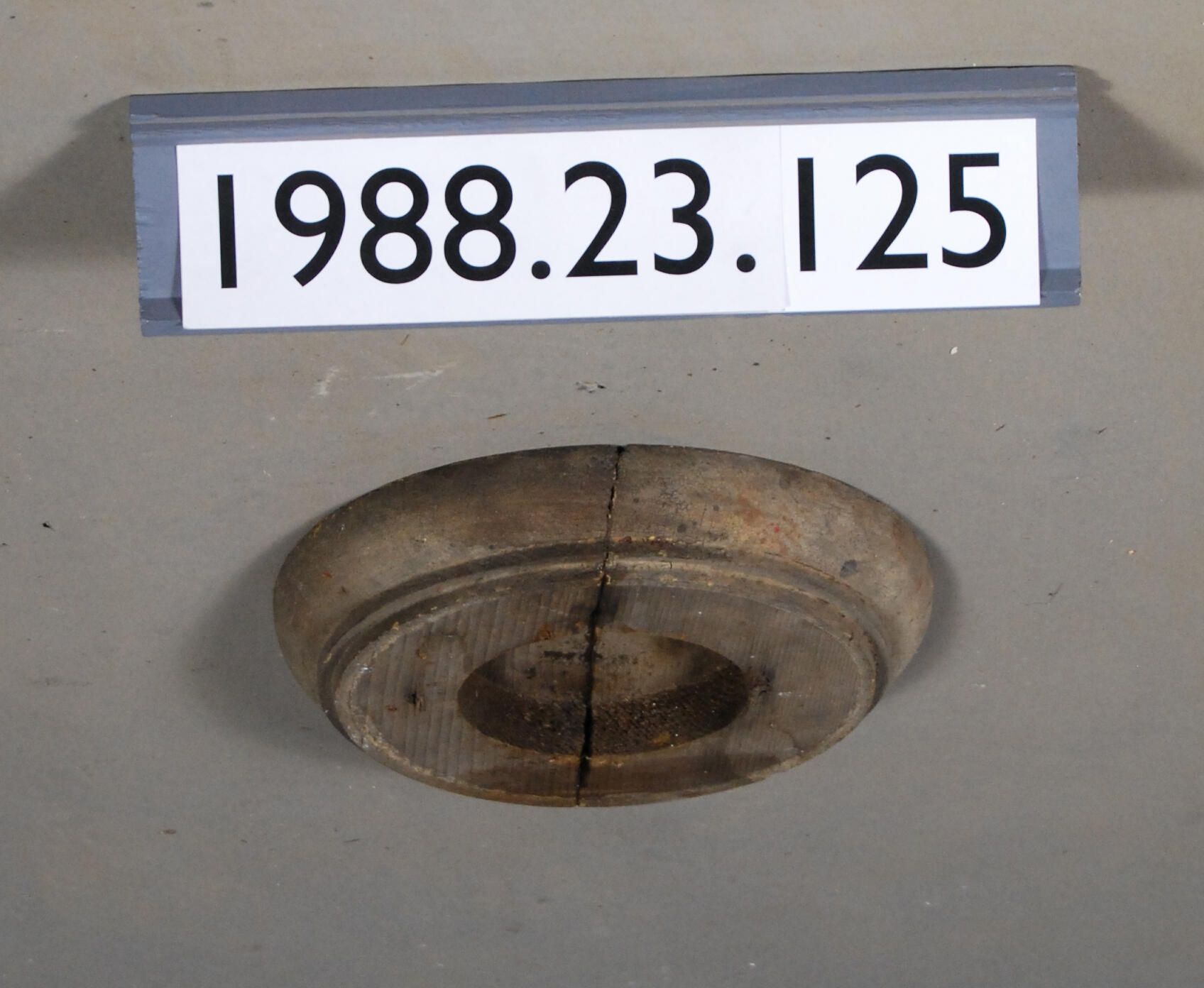Exterior wood cap block from Doric style column. (Probably from top). Circular. Has molded edge. One side has indent. Outer edge of cap is painted grey. (Broken into two parts).