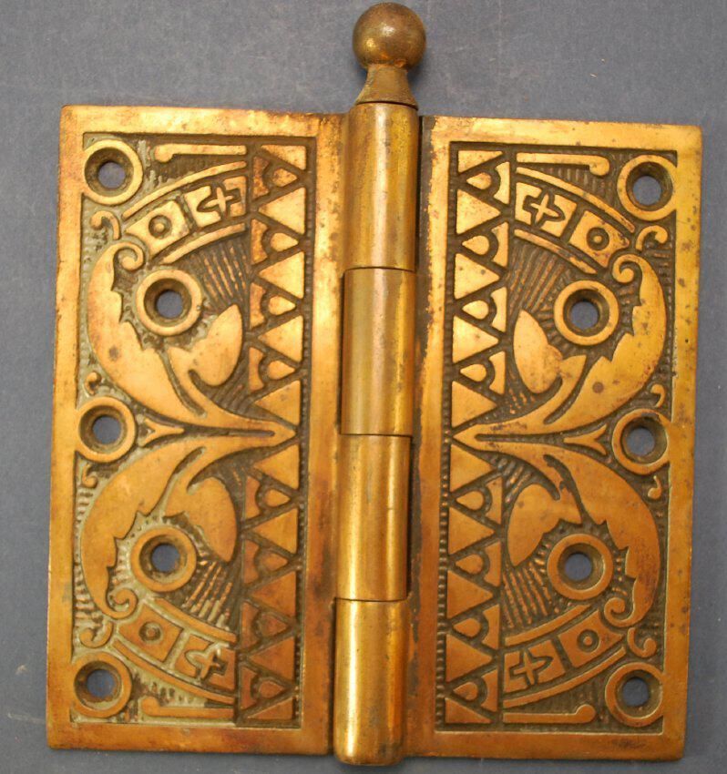 Design Name: Possible "Windsor" ? Manufacturer: Attributed to Lockwood Mfg. Co. Style: Eastlake Material: Iron Manufacturing Method: Cast Surface Finish: Plated / Japanned VDA Classification: VDA Number: Shape: Patent Specifics: Lock Type (If Applicable): Inscription/Makers Mark: Inscription Text: Comments: 6"x6", ball tipped, lower is missing; fixed joint, four knuckle.