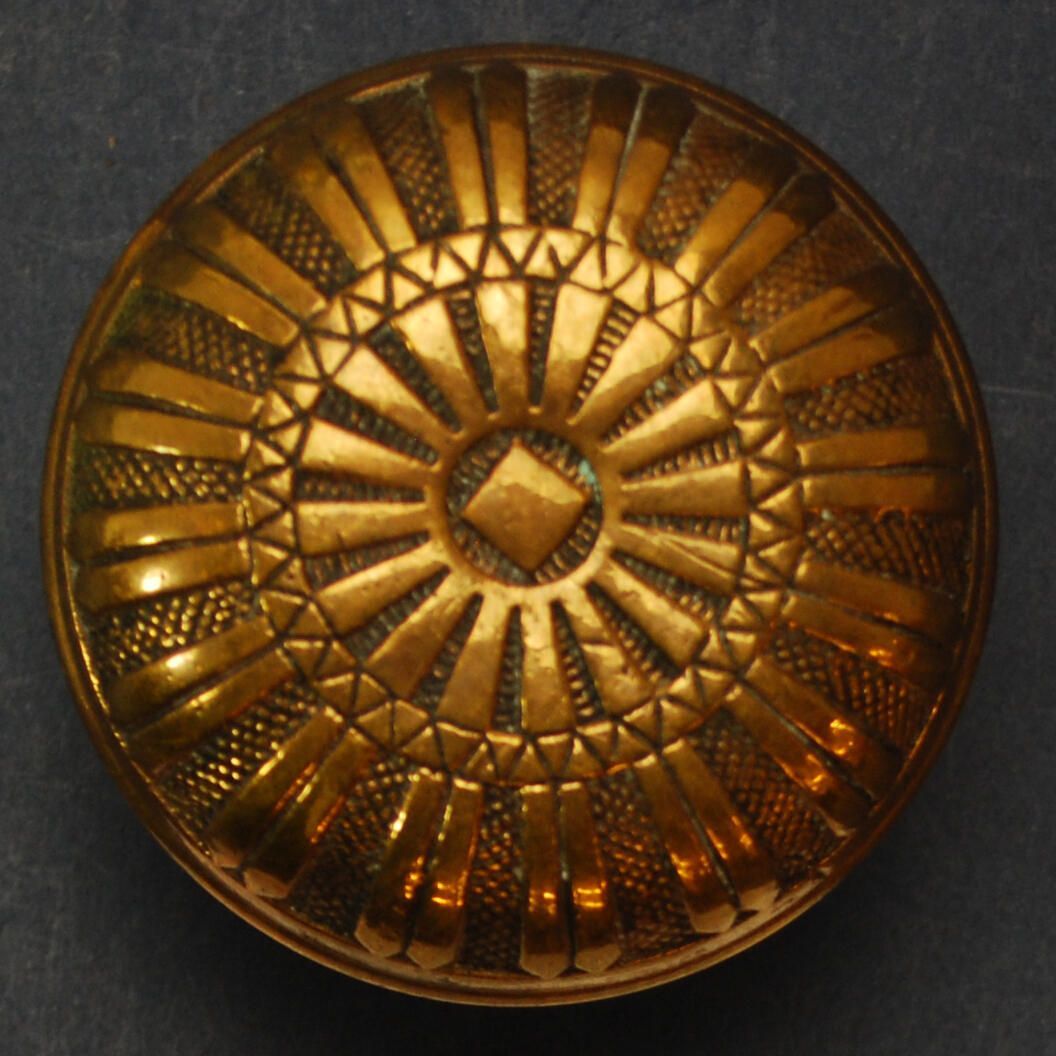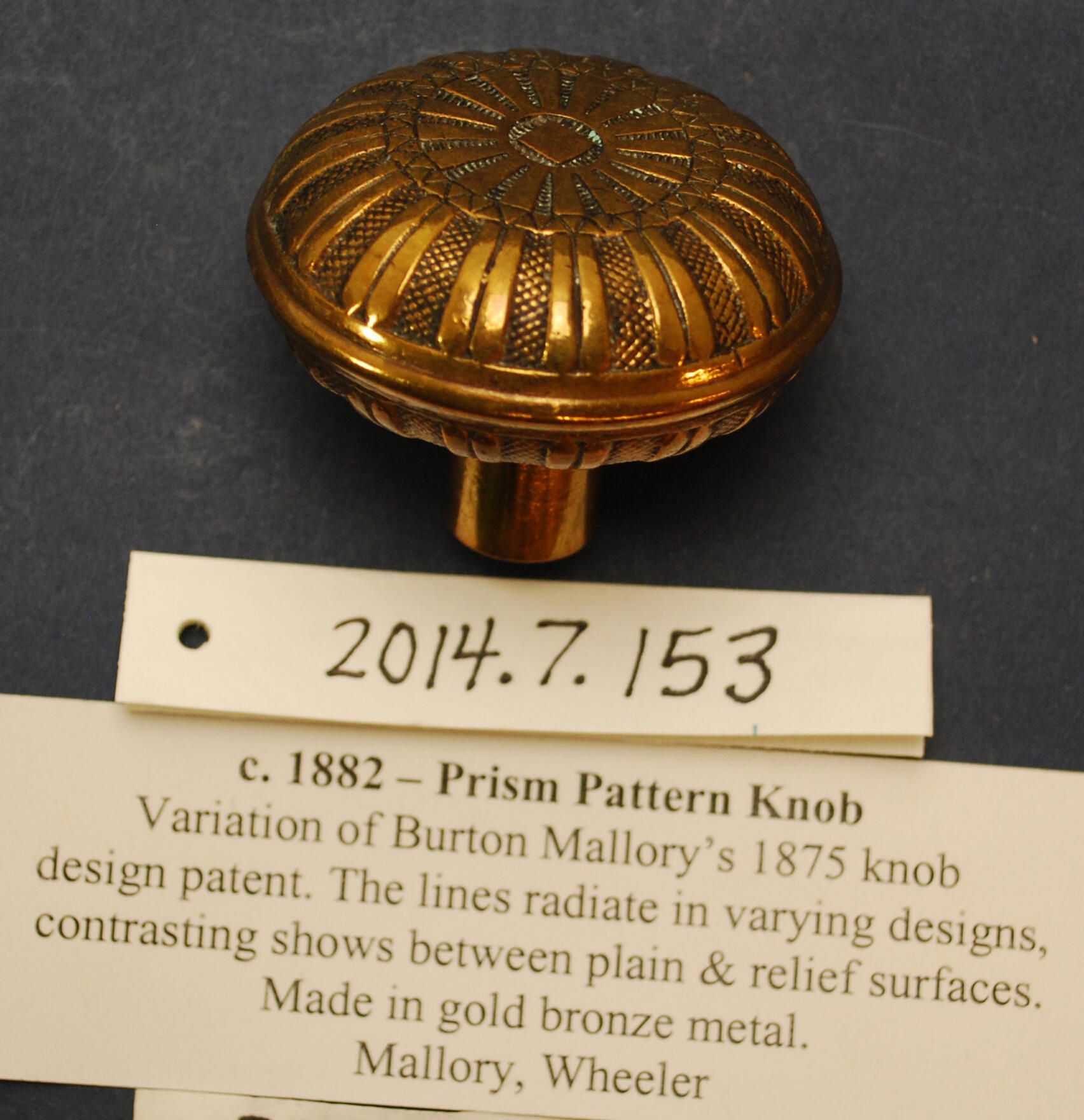 Design Name: Manufacturer: Mallory, Wheeler & Co. Style: Eastlake / Aesthetic Material: Bronze Manufacturing Method: Cast Surface Finish: VDA Classification: Radial VDA Number: L-108 Shape: Domed Patent Specifics: Variation on Burton Mallory's 1875 design patent? Lock Type (If Applicable): Inscription/Makers Mark: Inscription Text: Comments: Rear of knob has been pushed in.