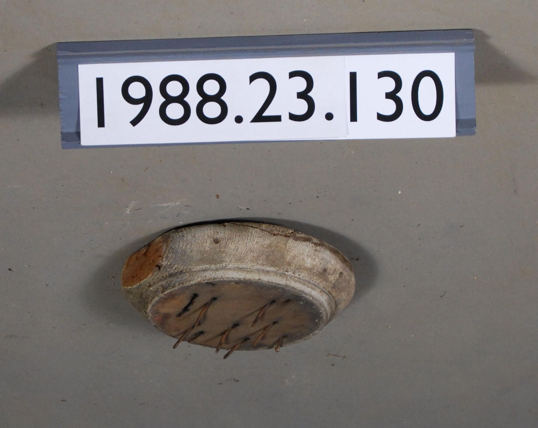 Exterior wood Doric style cap block. Could be top or base. Molded perimeter. Small piece is missing. Remnants of white paint.