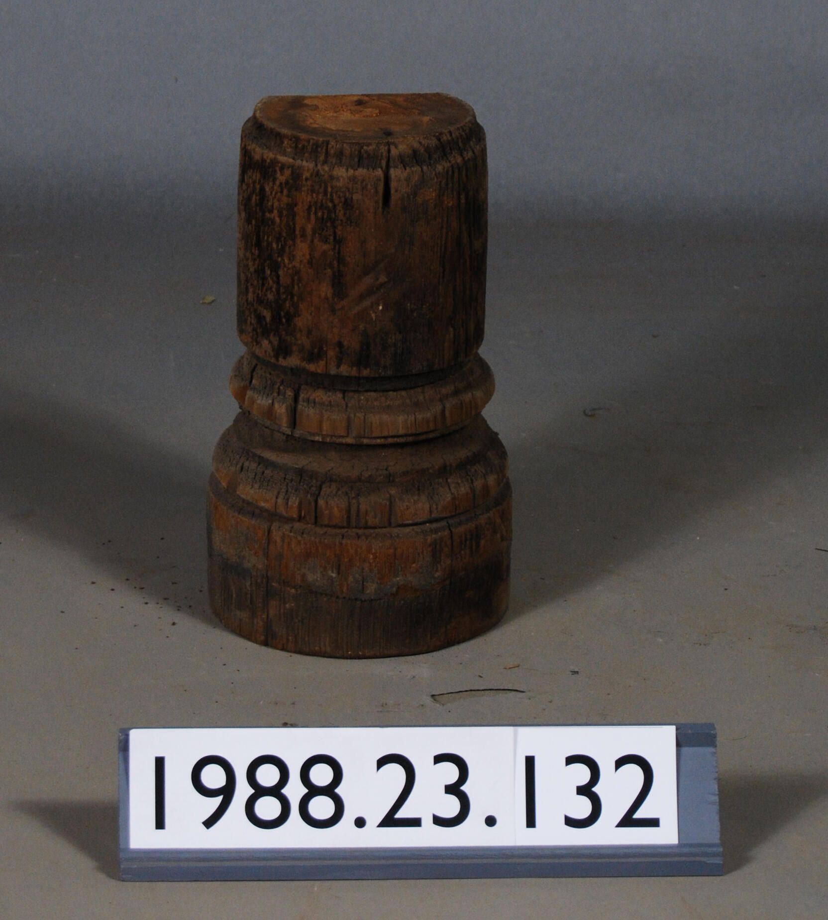Exterior wood column segments. Composed of two parts: Turned half-round in cross-section. Molded profile. Probable base. Second part is turned. Semi-cylindrical segment. Weathered surface.. Manufacturer: Place of Manufacturer: Design motif: Style: Finish: