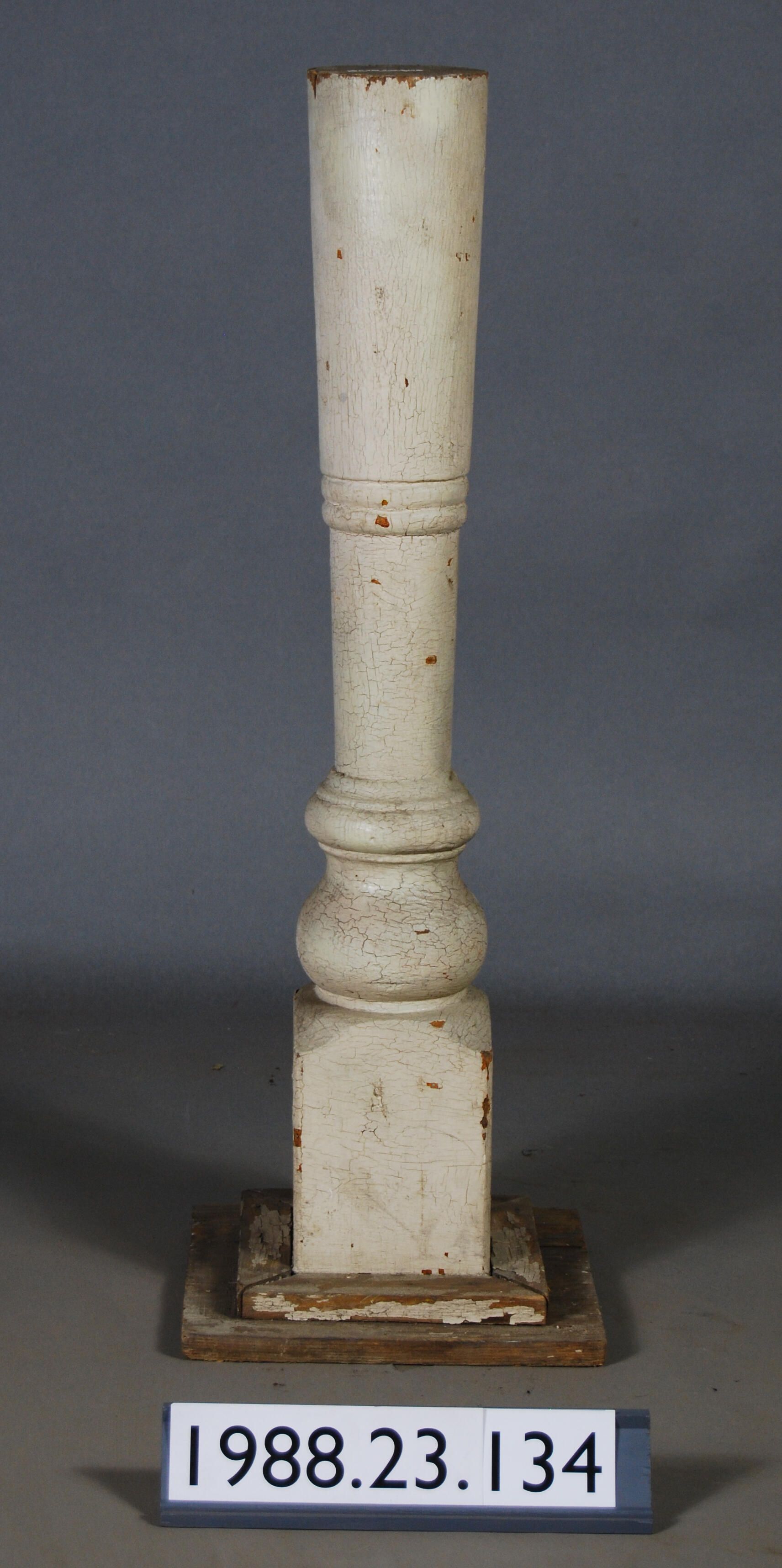 Exterior wood. Turned post. One end has square block with mitered plain molding. Other end is truncated (cut short from what was probably originally a porch post). Painted cream colored.