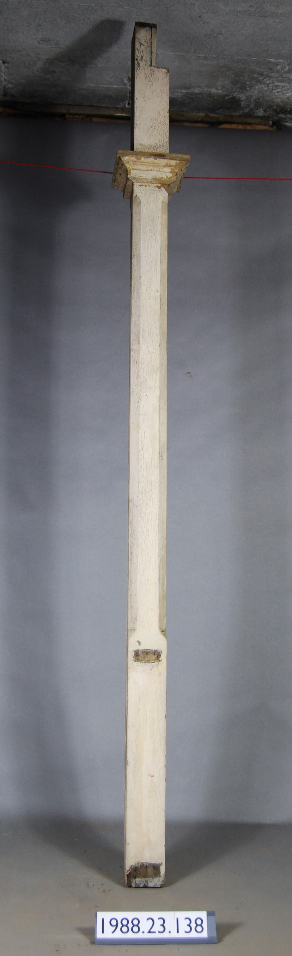 Exterior wood. Post. Square with stop-chamfered corners. Mitered moldings near upper end. Painted beige. Manufacturer: Place of Manufacturer: Design motif: Style: Finish: Painted