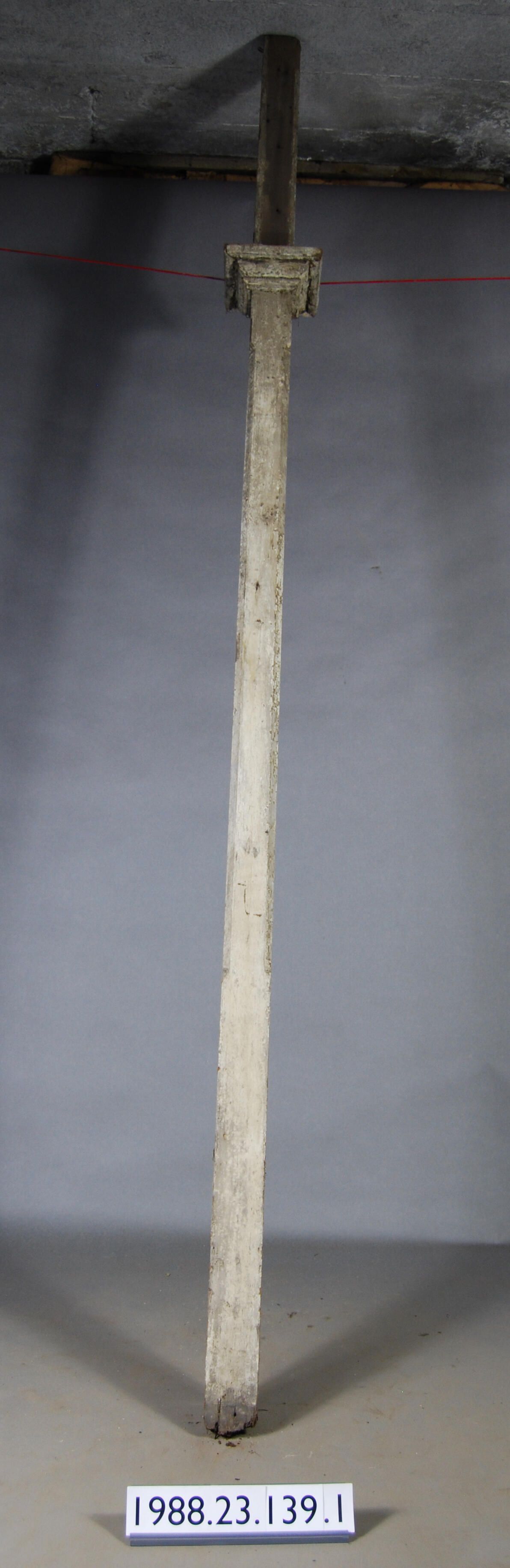 Exterior wood. Post. Square with stop-chamfered corners. Mitered moldings near upper end. Trim at bottom missing. Painted white or grey? Manufacturer: Place of Manufacturer: Design motif: Style: Finish: Painted