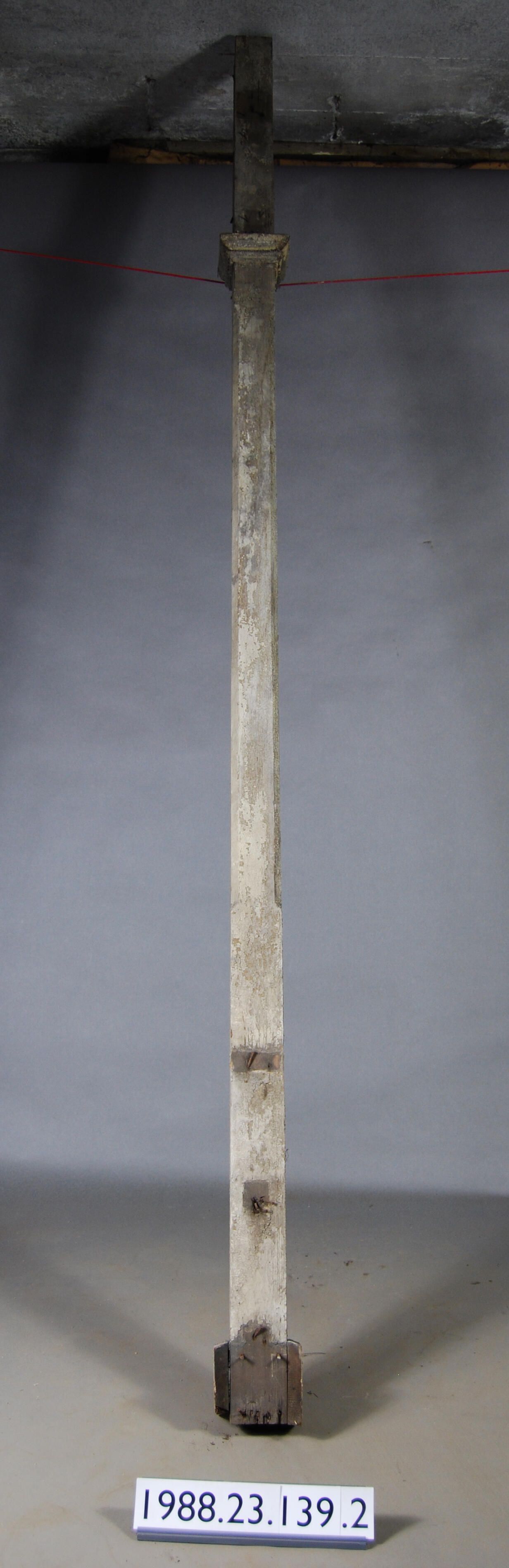 Exterior wood. Post. Square with stop-chamfering on two corners. Mitered moldings near upper end (on three sides). Two trim pieces at base. (One is missing). Painted white or grey.