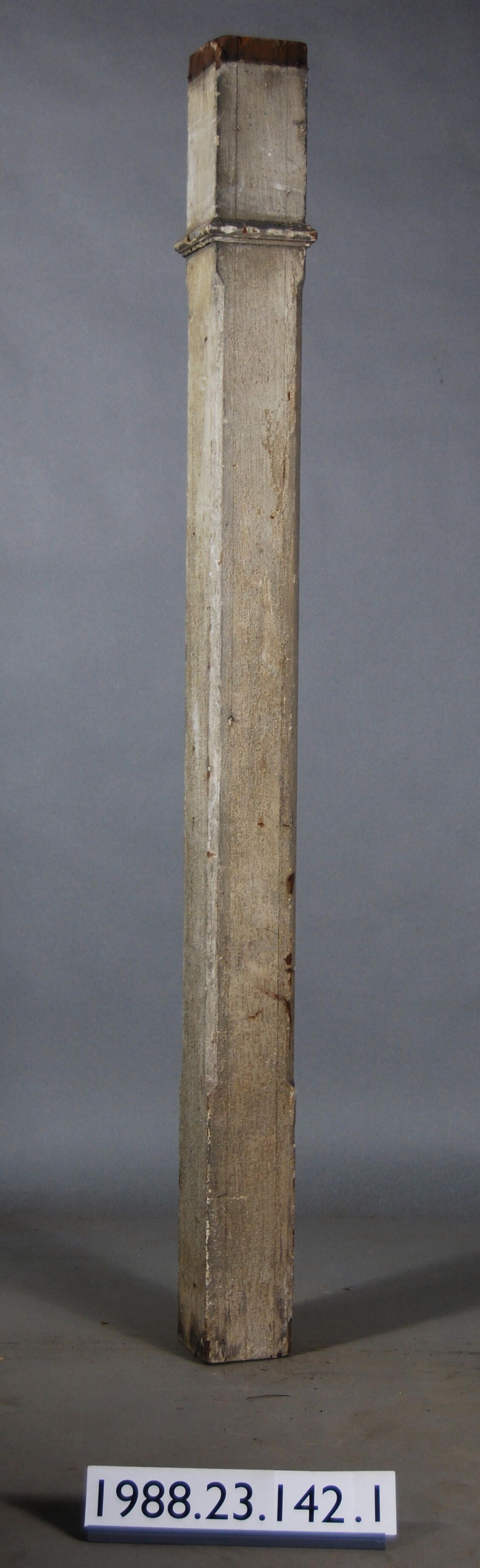 Exterior wood hollow-square box post. Has stop-chamfered corners. Cap block and upper moldings are missing. Has partial moldings on three sides. Painted grey or off-white. Manufacturer: Place of Manufacturer: Design motif: Style: Finish: Painted