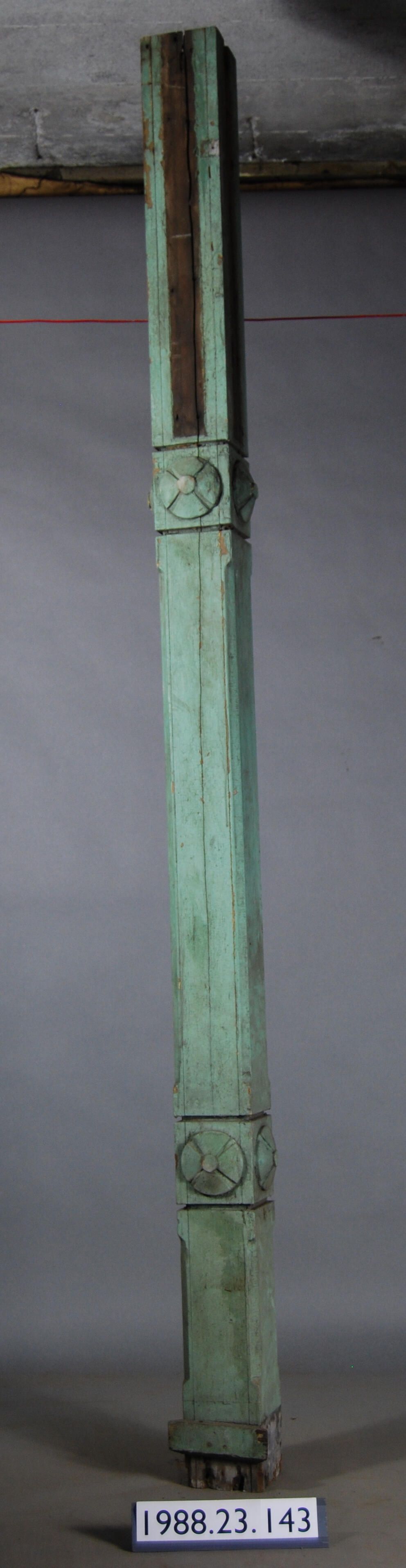 Exterior wood hollow-square box post. Stop-chamfered corners. Has series of circular geometric / botanical motif. Applied rosette ornaments. Partial base molding. Associated with bracket series 1988.6.156. Painted green.