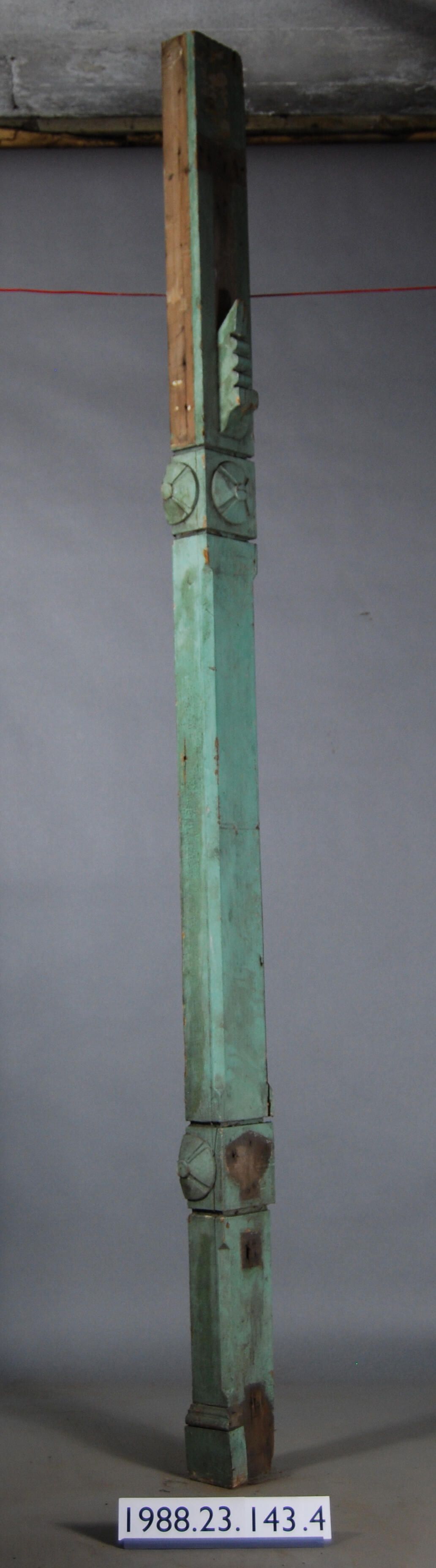 Exterior wood hollow-square box post / pilaster. (Three sided). Has series of geometric / botanical motif. Applied rosette ornaments. Has partial base moldings. Has remnant of bracket attached., Associated with bracket series 1988.6.156. Painted green.