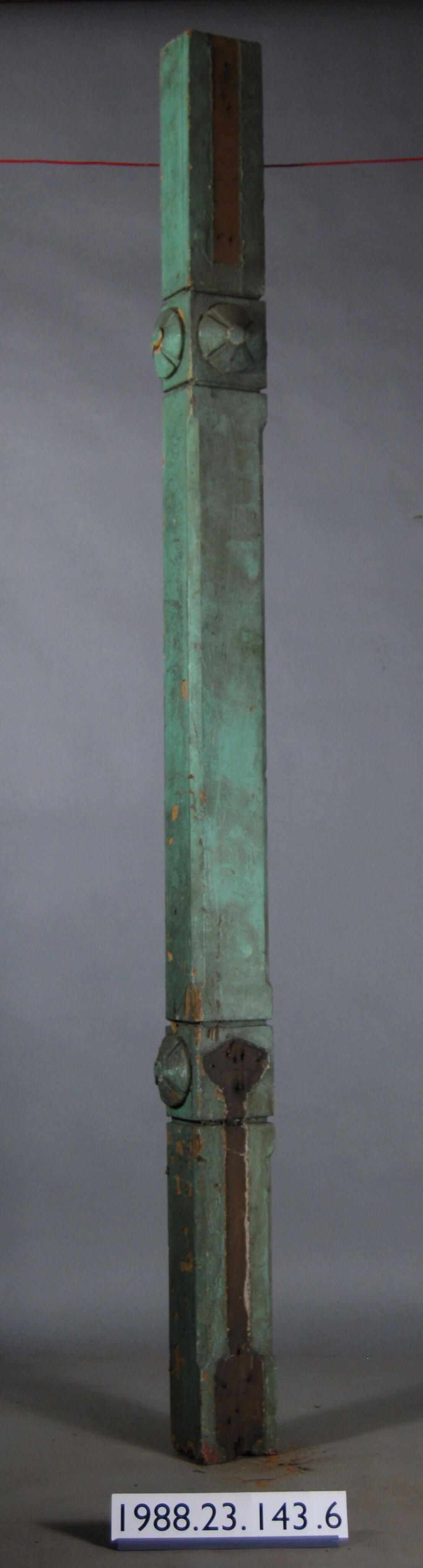 Exterior wood hollow-square box post / pilaster. (Has series of geometric / botanical motif. Applied rosette ornaments. Associated with bracket series 1988.6.156. Painted green. Manufacturer: Place of Manufacturer: Design motif: Geometric / Botanical Motif Style: Finish: Painted