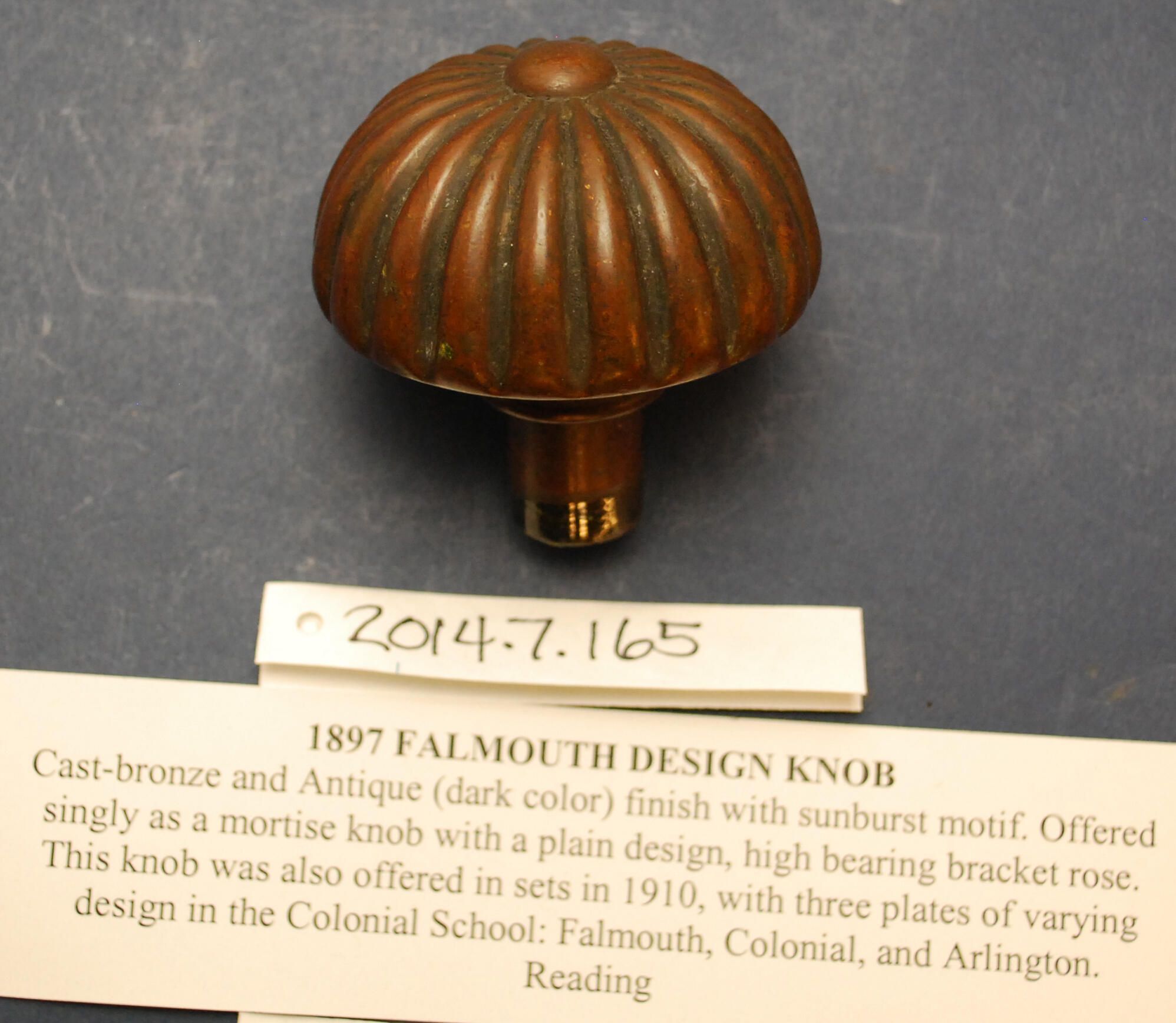 Design Name: Falmouth Manufacturer: Reading Hardware Co. Style: Colonial Revival Material: Bronze Manufacturing Method: Radial Surface Finish: Aged / Unpolished VDA Classification: Radial VDA Number: Shape: Domed Patent Specifics: Lock Type (If Applicable): Inscription/Makers Mark: Inscription Text: Comments: Not found in VDA catalog.