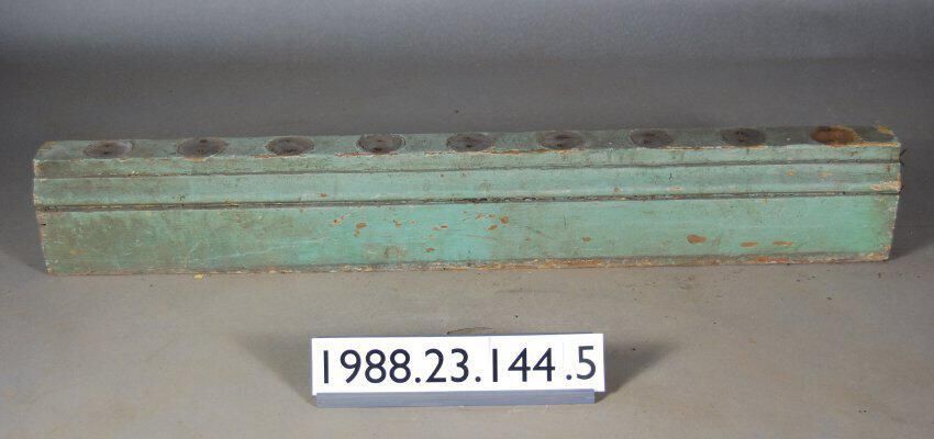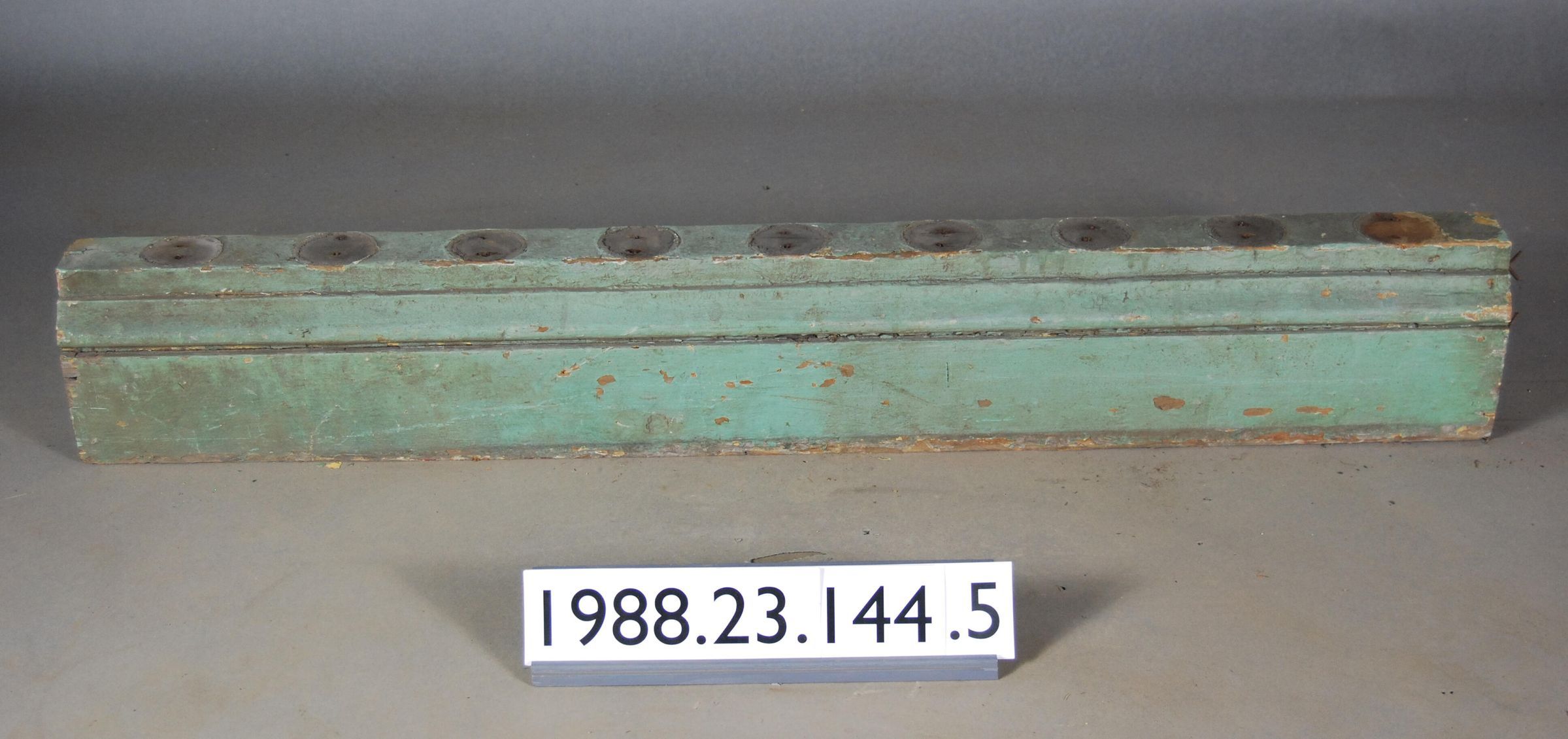 Exterior wood railing base. Composed of beam. Side moldings and base shoe plates. Painted green. Associated with post series 1988.23.143.