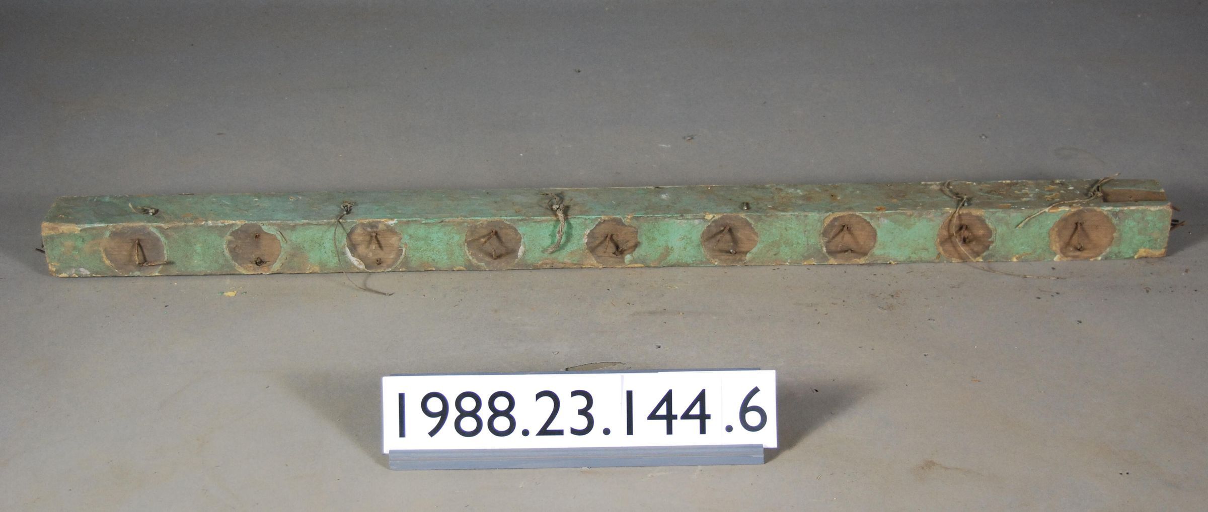 Exterior wood railing component. Plain horizontal rail. Painted green. Associated with post series 1988.23.143.