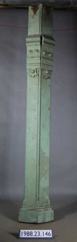 Exterior wood vertical trim composed of two boards joined at edge to form angular configuration. Has base moldings. Applied block ornaments with bulls-eyes and botanical motif drop ornaments. Painted green.