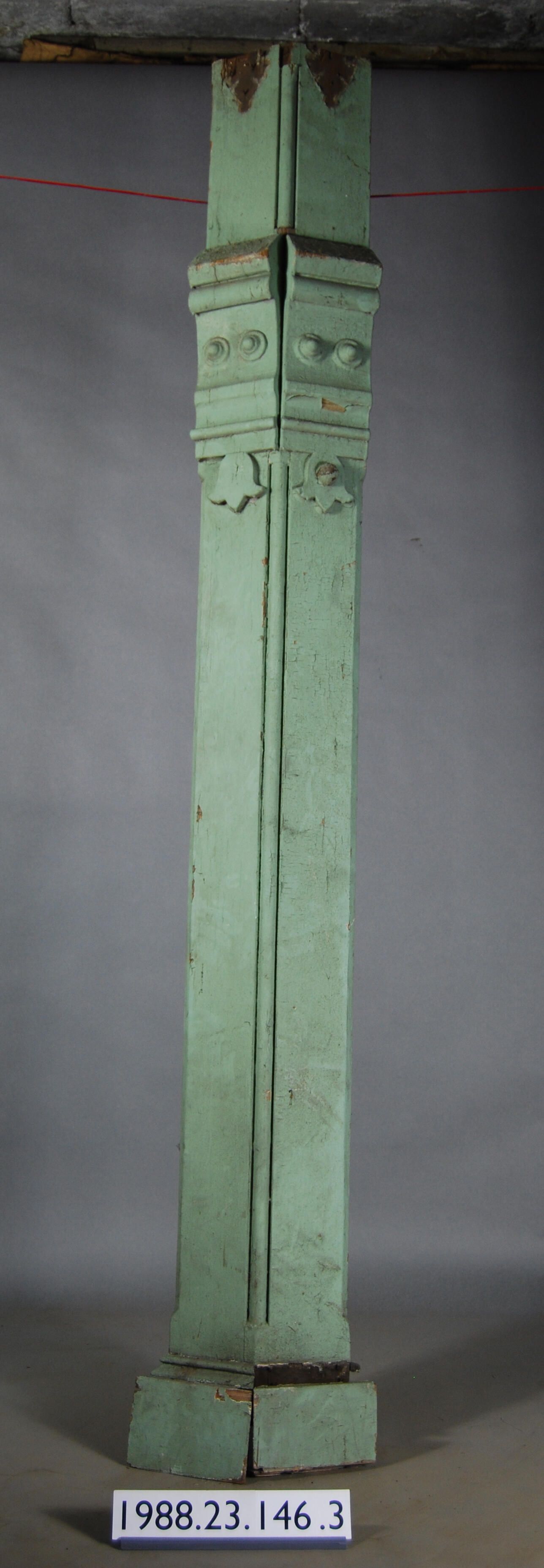 Exterior wood vertical trim composed of two boards joined at edge to form angular configuration. Has incomplete base moldings. Applied block ornaments with bulls-eyes and botanical motif drop ornaments. Painted green.