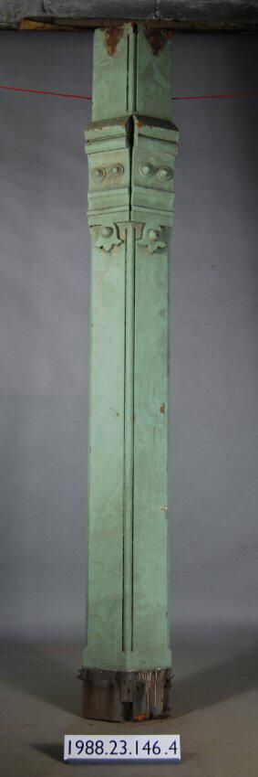 Exterior wood vertical trim composed of two boards joined at edge to form angular configuration. Base moldings are missing. Applied block ornaments with bulls-eyes and botanical motif drop ornaments. Painted green.