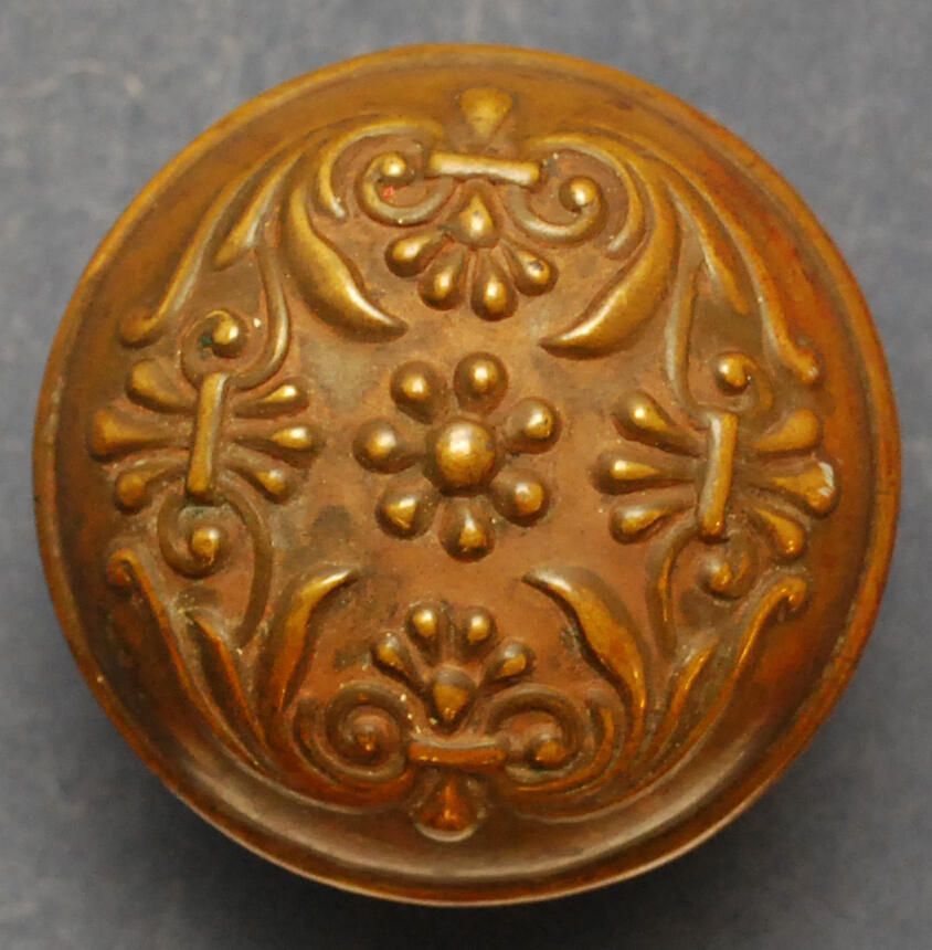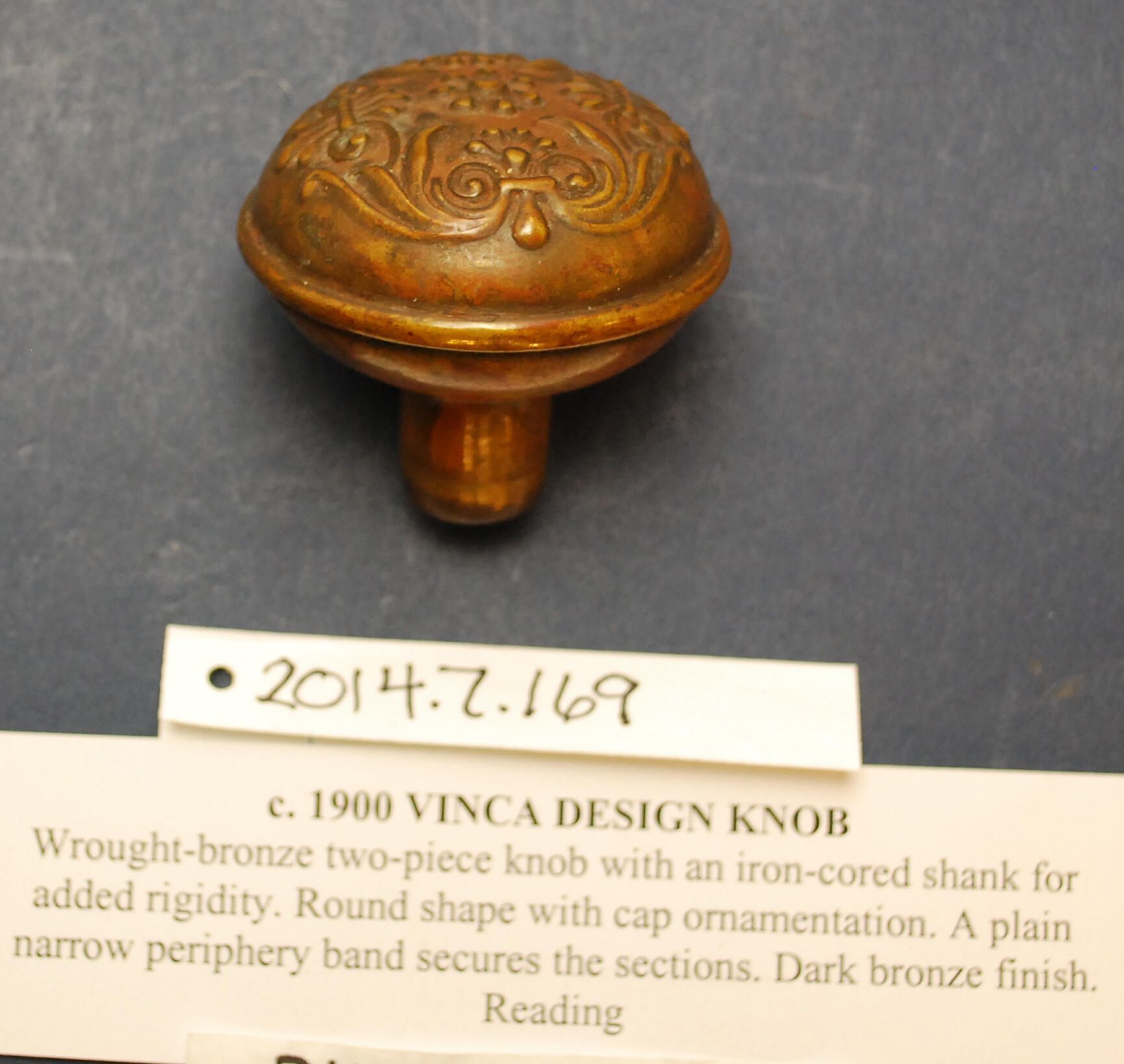 Design Name: Vinca Manufacturer: Reading Hardware Co. Style: Material: Bronze Manufacturing Method: Wrought / Stamped Surface Finish: Aged / Unpolished VDA Classification: Twofold VDA Number: F-219 Shape: Domed Patent Specifics: Lock Type (If Applicable): Inscription/Makers Mark: Inscription Text: Comments: