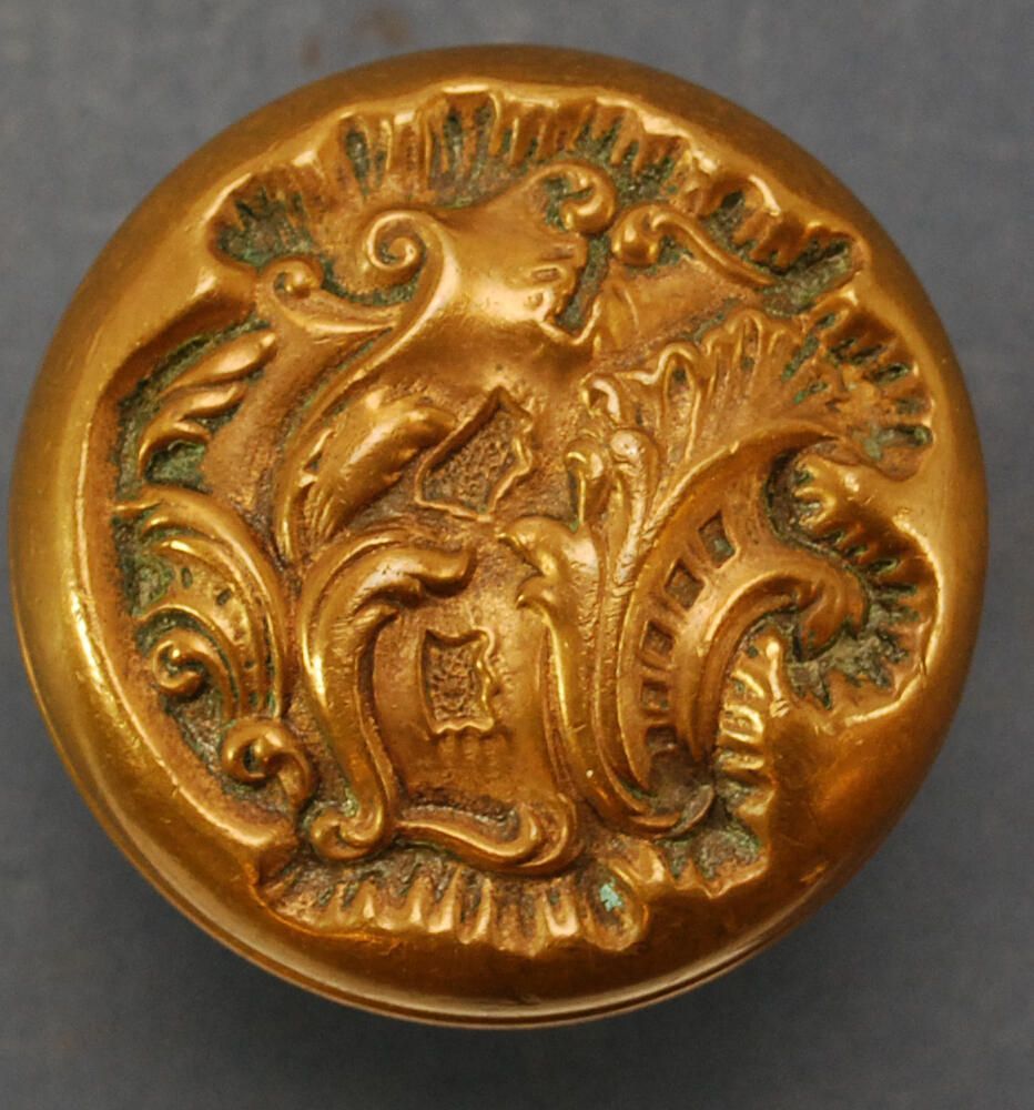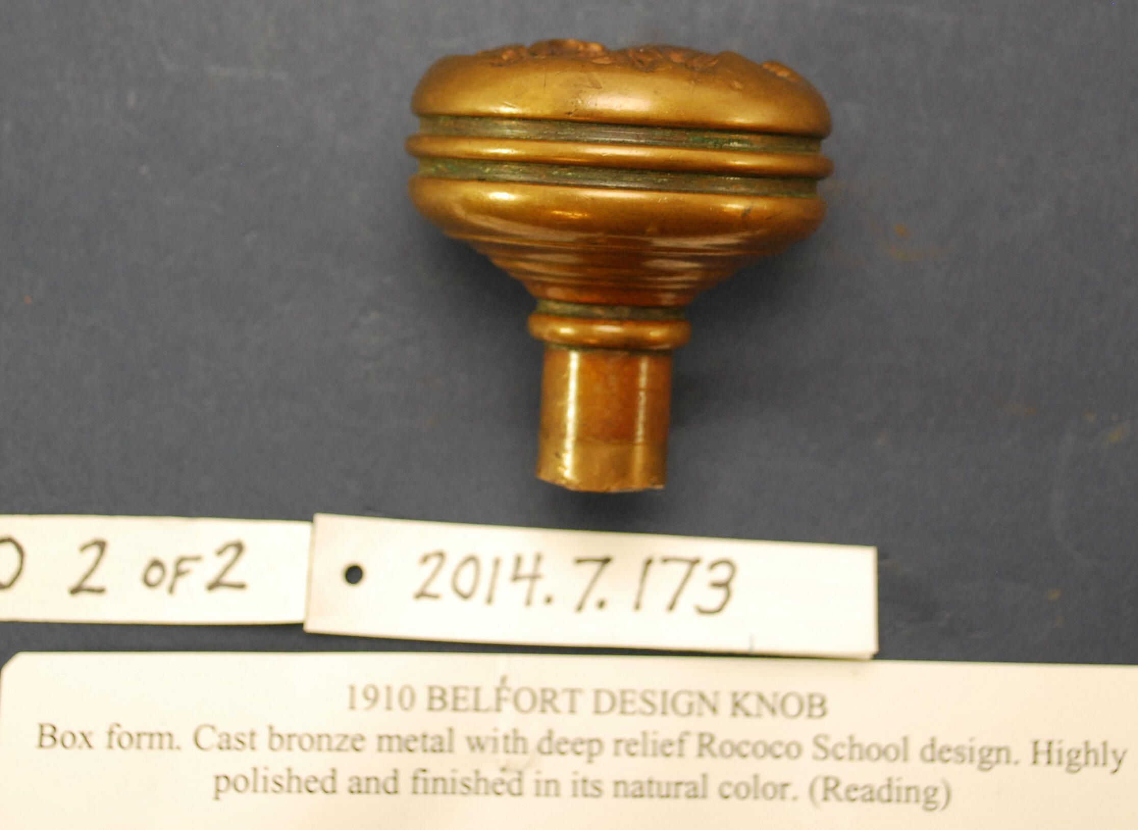 Design Name: Belfort Manufacturer: Reading Hardware Co. Style: Rococo Material: Bronze Manufacturing Method: Cast Surface Finish: Aged / Unpolished VDA Classification: Asymmetric VDA Number: B-211 Shape: Domed Patent Specifics: Lock Type (If Applicable): Inscription/Makers Mark: Inscription Text: Comments: