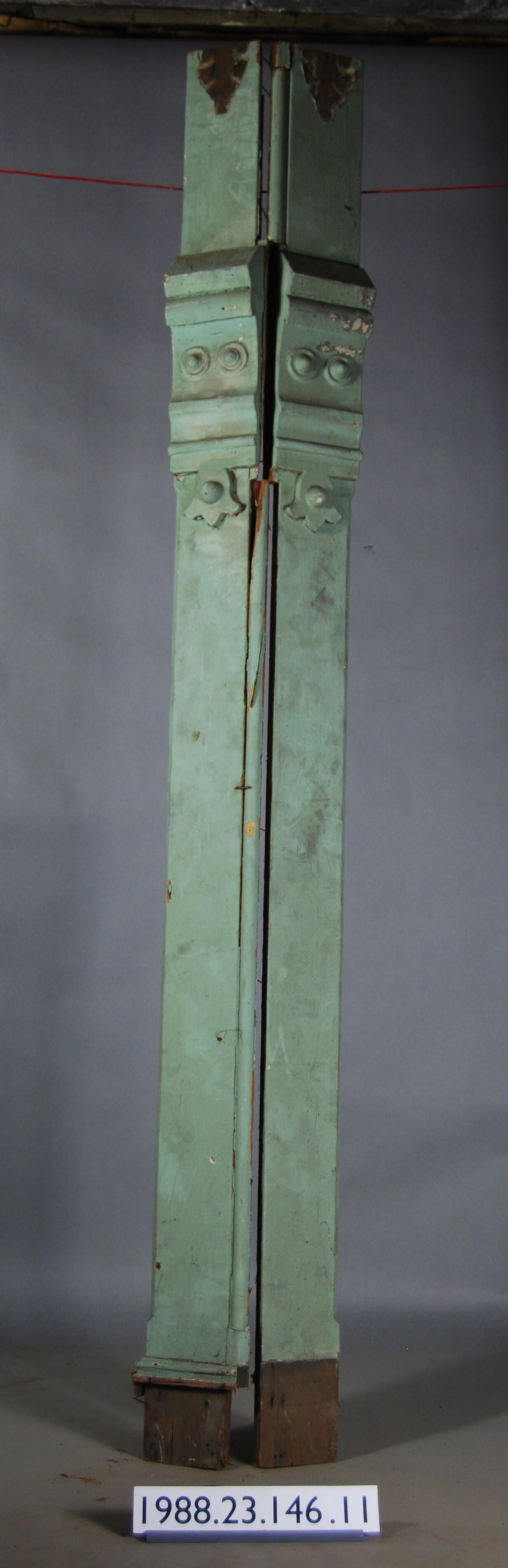 Exterior wood vertical trim composed of two boards originally joined at edge to form angular configuration (now detached). Has base molding fragment. Has applied block ornaments. Painted green.
