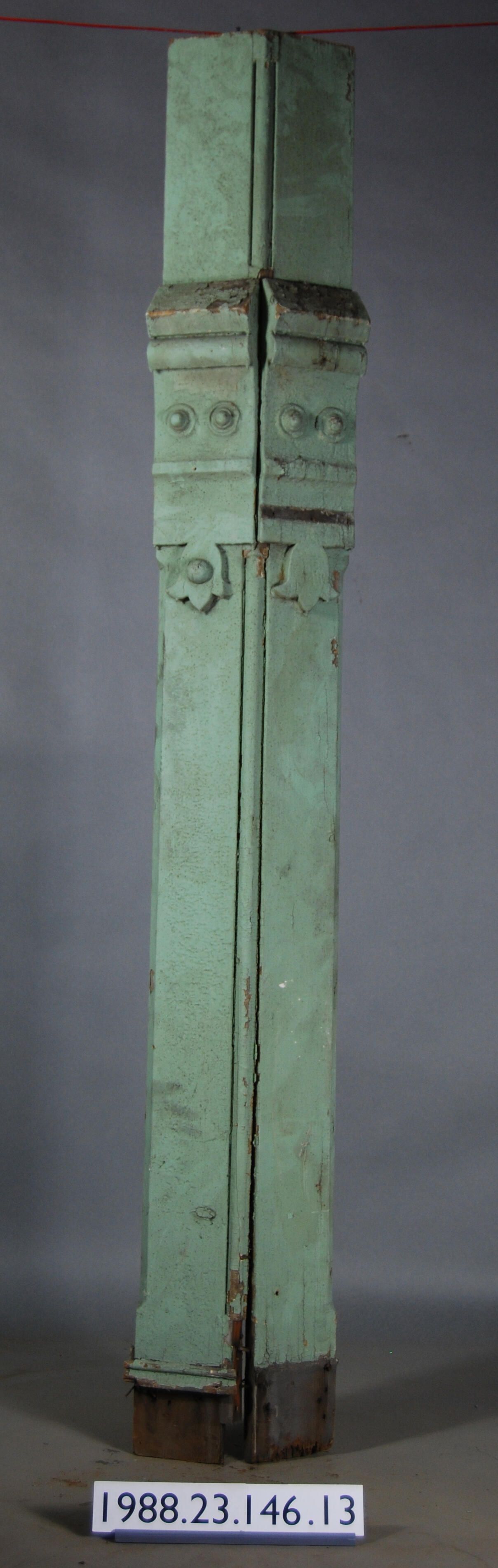 Exterior wood vertical trim composed of two boards joined at edge to form angular configuration (now detached). Has base molding fragment. Has applied block ornaments. Painted green.