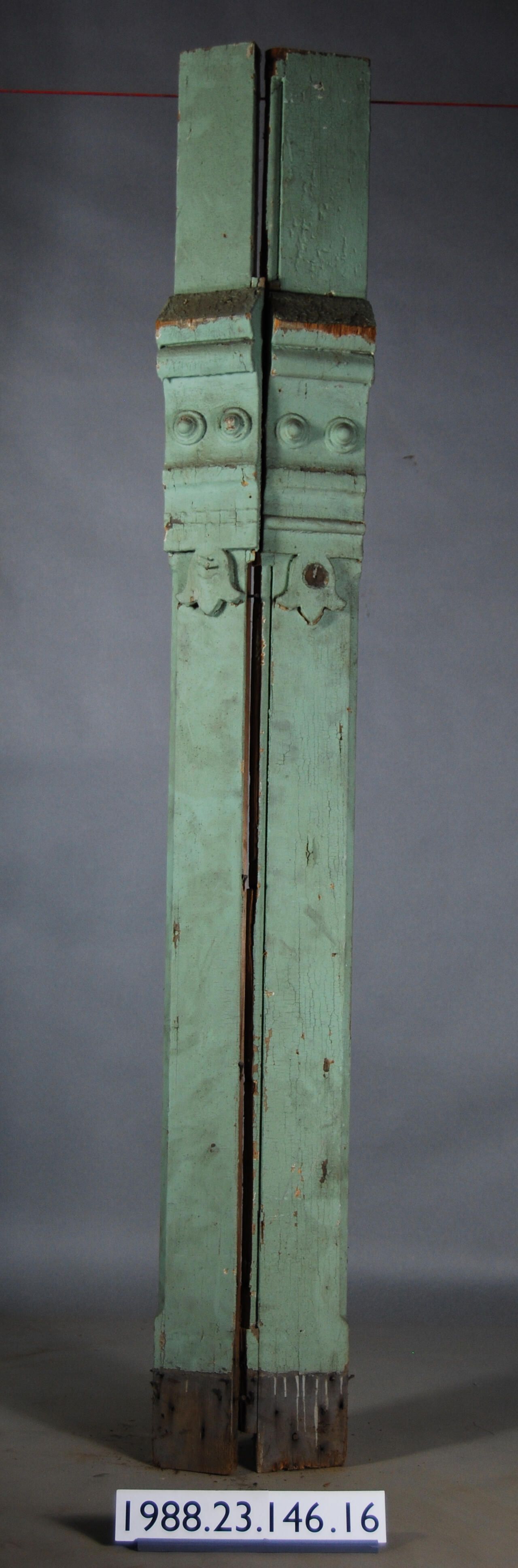 Exterior wood vertical trim composed of two boards originally joined at edge to form angular configuration (now broken apart). Base moldings are missing. Has applied block ornaments. Painted green.