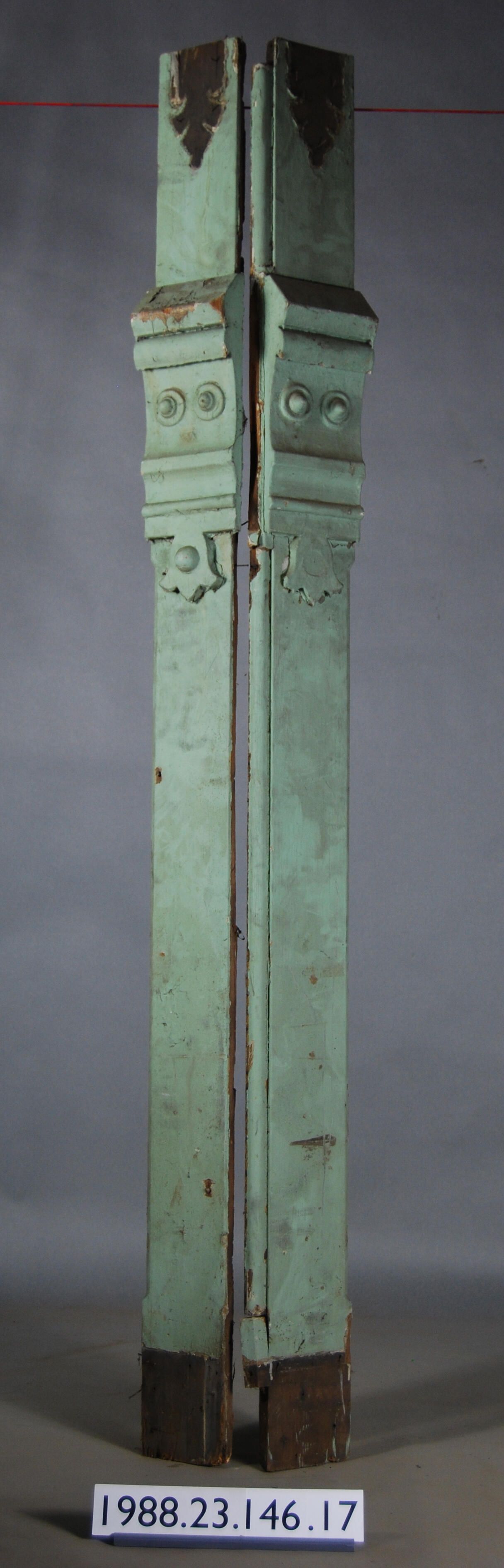 Exterior wood vertical trim composed of two boards originally joined at edge to form angular configuration (now broken apart). Base moldings are missing. Has applied block ornaments. Painted green.