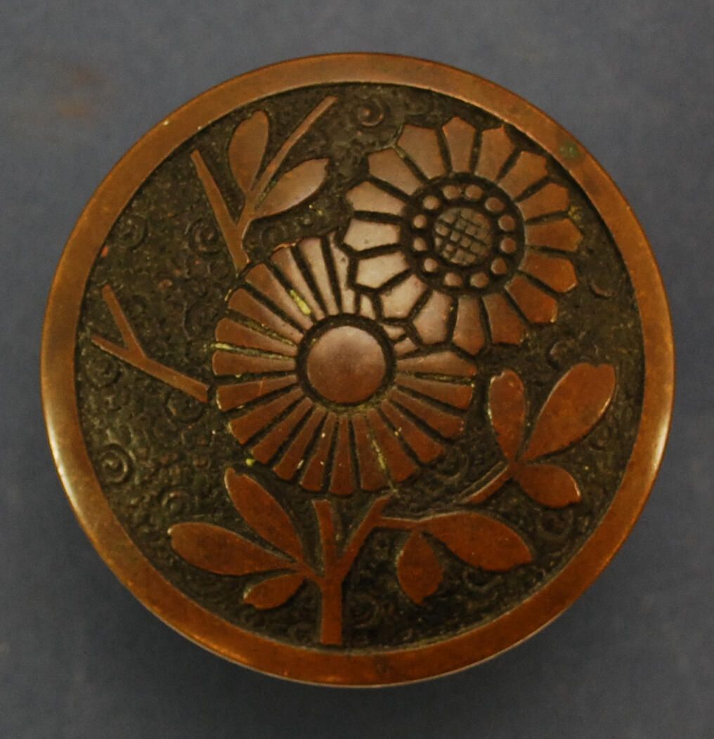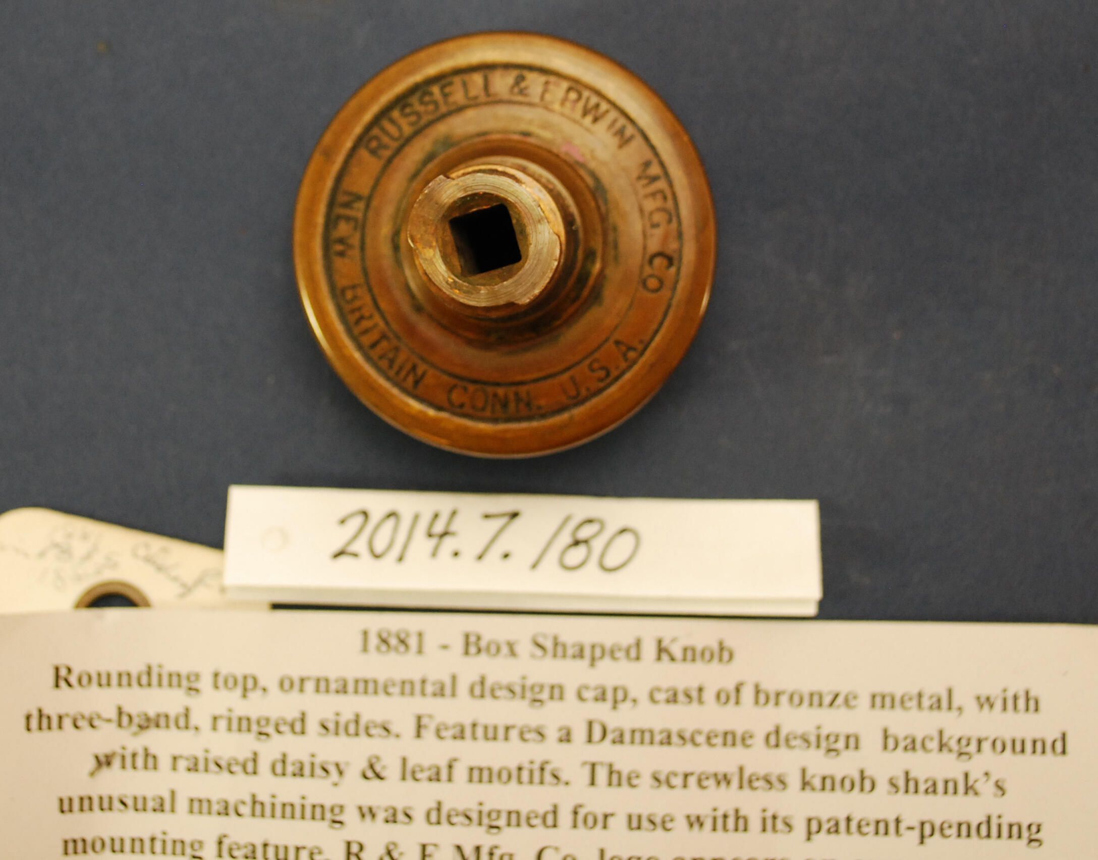 Design Name: Manufacturer: Russell & Erwin Mfg. Co. Style: Aesthetic Material: Bronze Manufacturing Method: Cast Surface Finish: Aged / Unpolished VDA Classification: Representational VDA Number: A- Shape: Domed / Drum Patent Specifics: Lock Type (If Applicable): Inscription/Makers Mark: Russell & Erwin Mfg. Co. New Britain Conn. Inscription Text: Comments: Stamped with manufacturer's mark on back of doorknob. Not found in VDA catalog.