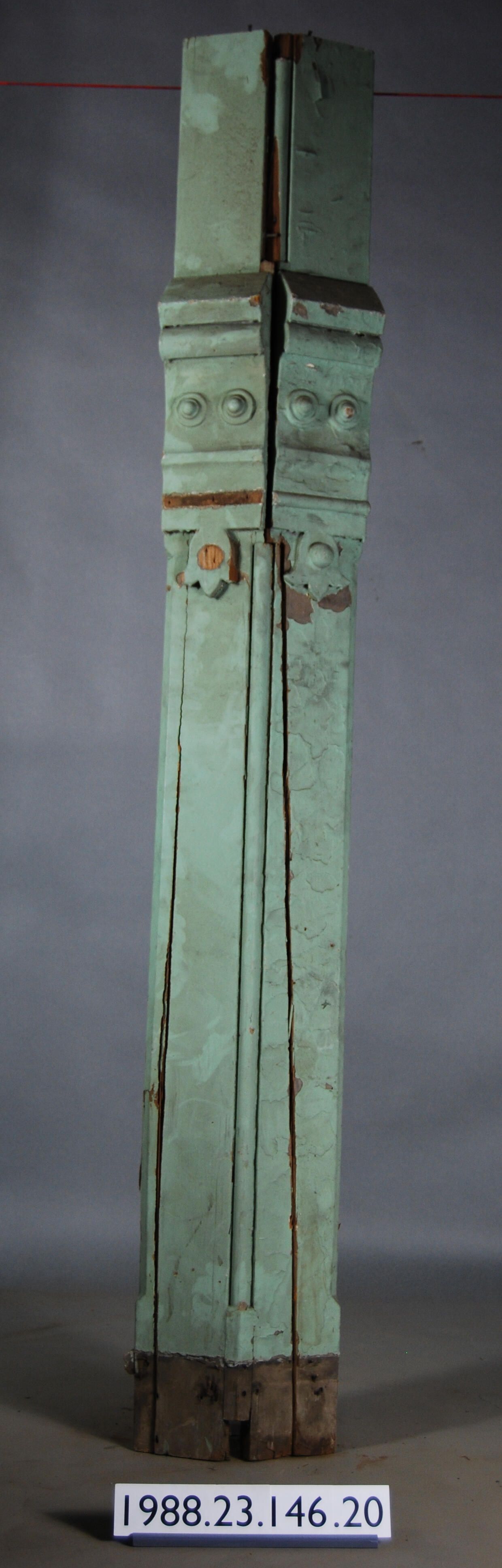 Exterior wood vertical trim composed of two boards originally joined at edge to form angular configuration (now broken apart). Has small fragment of base molding. Has applied block ornament. Painted green.