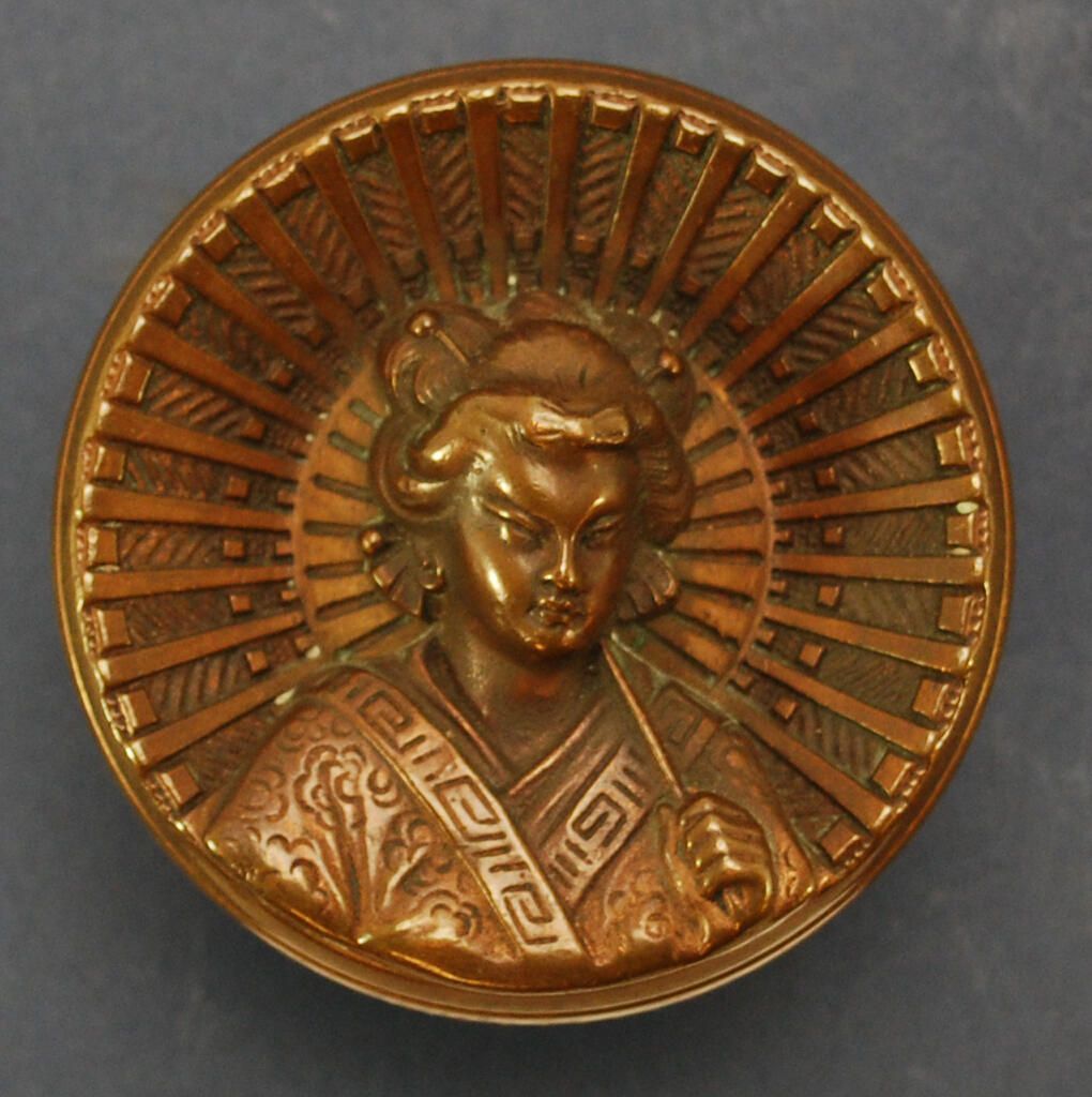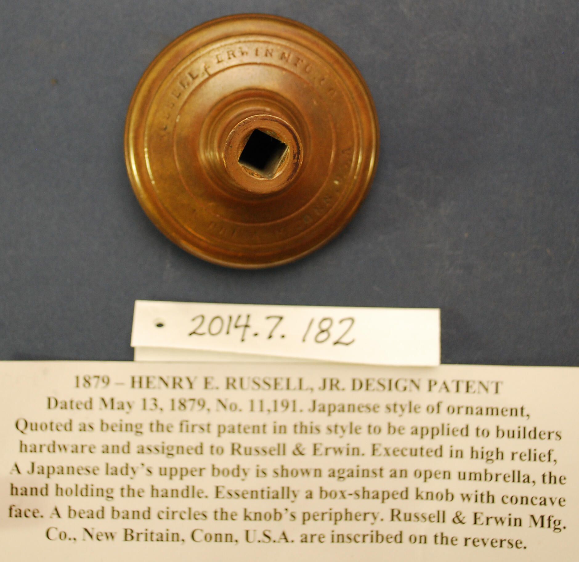 Design Name: Manufacturer: Russell & Erwin Mfg. Co. Style: Japanese Material: Bronze Manufacturing Method: Cast Surface Finish: Aged / Unpolished VDA Classification: A- Representational VDA Number: A-304 Shape: Sunken Center Patent Specifics: May 13, 1878 H.E. Russell Jr. Design Lock Type (If Applicable): Inscription/Makers Mark: Russell & Erwin Mfg. Co. New Britain Conn. Inscription Text: Comments: