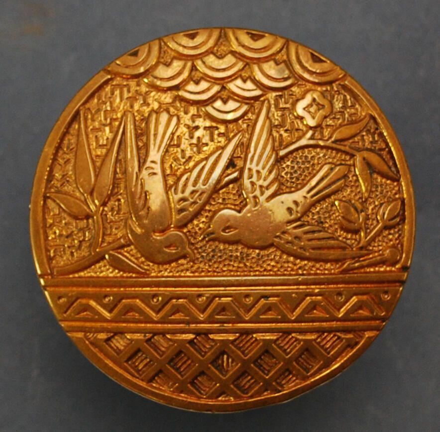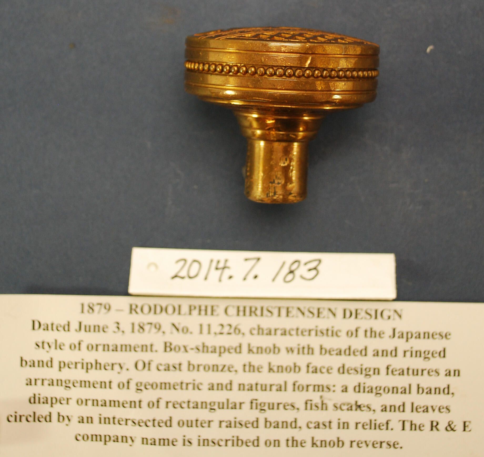 Design Name: Manufacturer: Russell & Erwin Mfg. Co. Style: Material: Bronze Manufacturing Method: Cast Surface Finish: VDA Classification: A- Representational VDA Number: A-105 Shape: Domed / Drum Patent Specifics: June 3, 1879 Lock Type (If Applicable): Inscription/Makers Mark: Russell & Erwin Mfg. Co. New Britain Conn. Inscription Text: Comments: Minor damage around shank and on knob back.