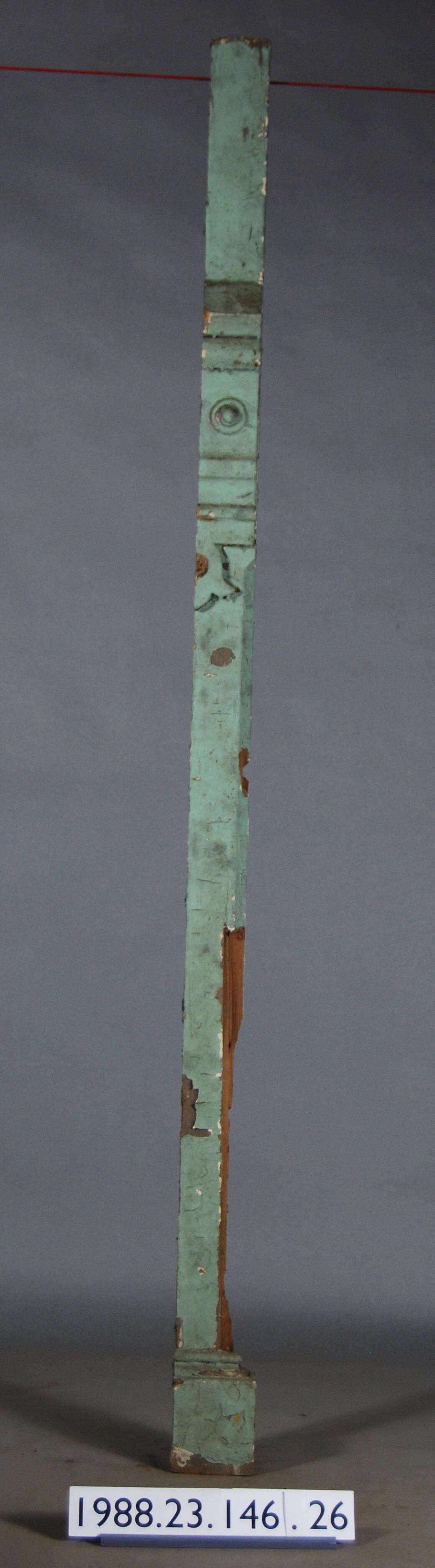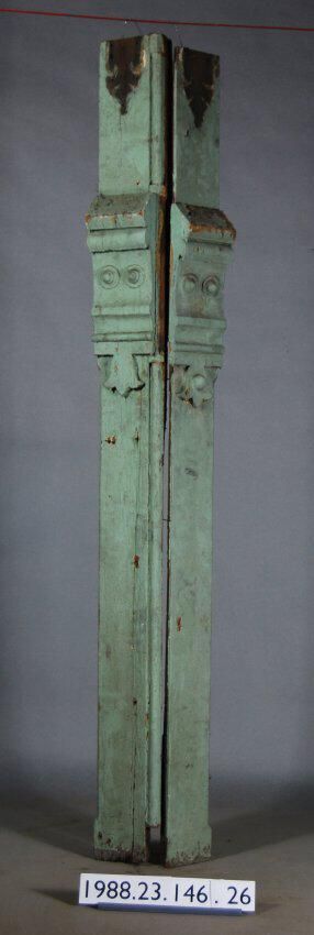 Exterior wood vertical trim. Has base molding and block ornament. (Section missing at edge). Painted green.