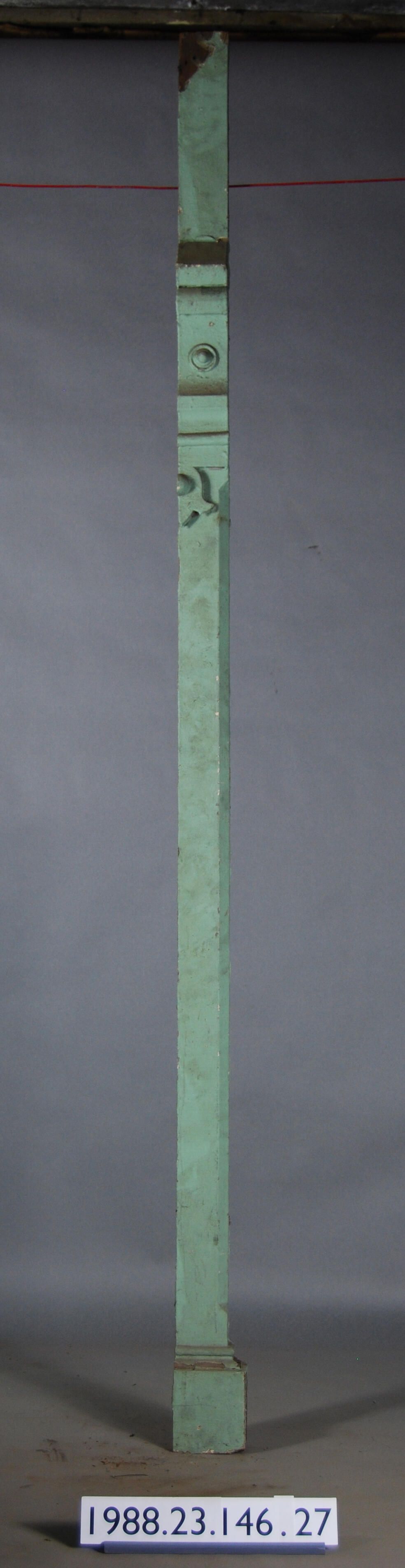 Exterior wood vertical trim. Has base molding and block ornament. Painted green. Manufacturer: Place of Manufacturer: Design motif: Style: Finish: Painted