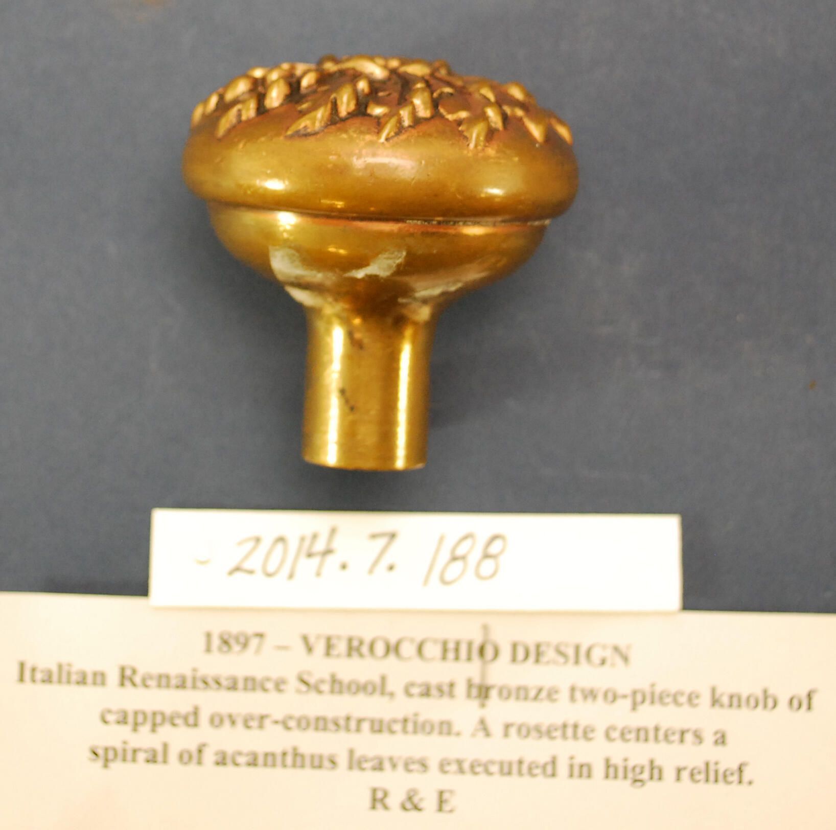 Design Name: Verocchio Manufacturer: Russell & Erwin Mfg. Co. Style: Italian Renaissance Material: Bronze Manufacturing Method: Cast Surface Finish: Aged / Unpolished / Plated VDA Classification: VDA Number: E-127 Shape: Patent Specifics: Lock Type (If Applicable): Inscription/Makers Mark: Inscription Text: Comments: May have remnants of gilting.
