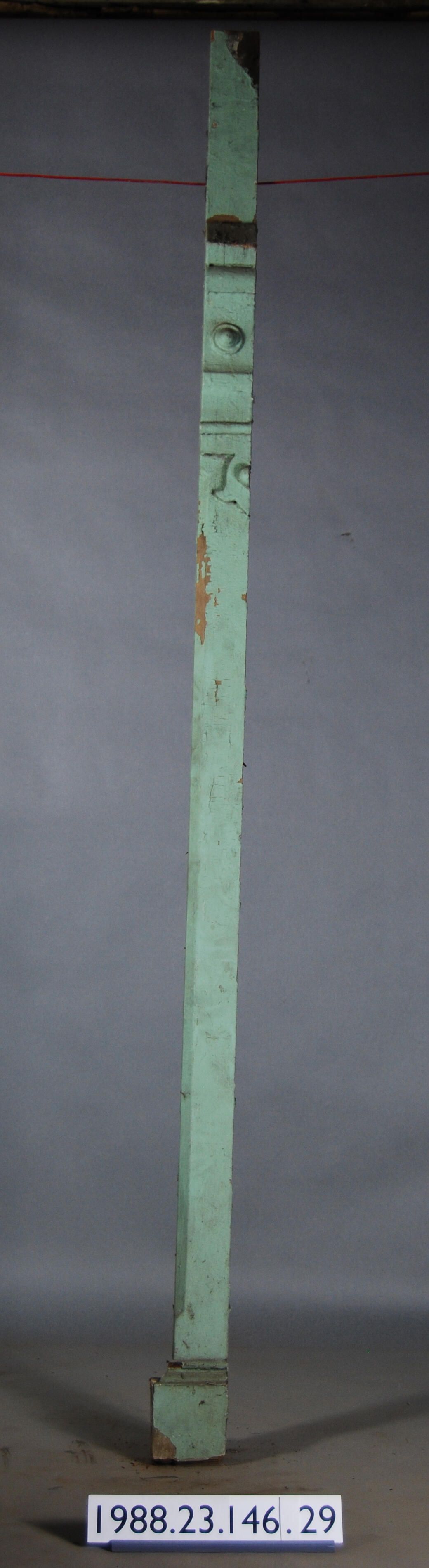 Exterior wood vertical trim. Has base molding and block ornament. Painted green. Manufacturer: Place of Manufacturer: Design motif: Style: Finish: Painted
