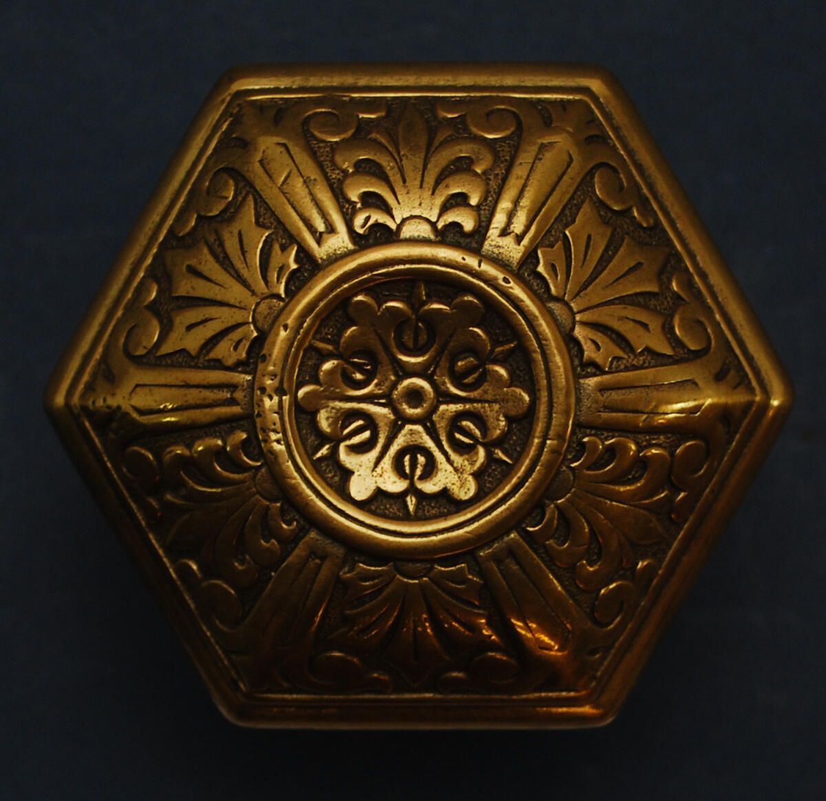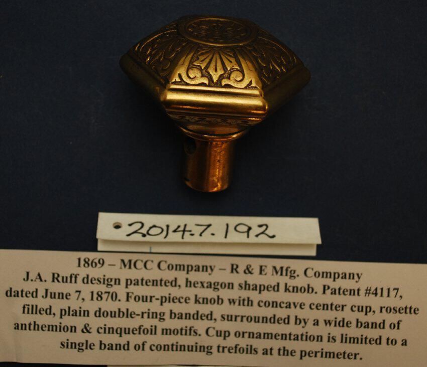 Design Name: Manufacturer: Russell & Erwin Mfg. Co. Style: Material: Bronze Manufacturing Method: Cast Surface Finish: Aged / Unpolished VDA Classification: Odd-Shaped VDA Number: C-105 Shape: Hexagonal Patent Specifics: Pat'd #4117, June 7, 1870 Lock Type (If Applicable): Inscription/Makers Mark: Inscription Text: Comments: