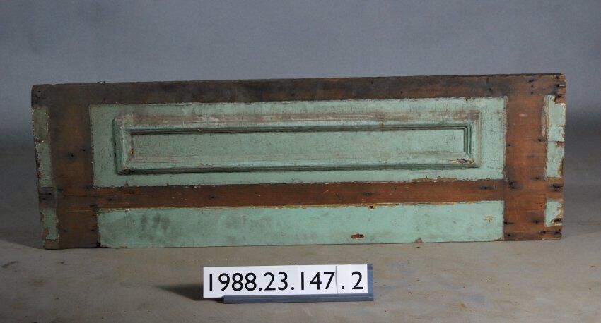 Exterior wood panel. Broad single board with applied moldings. Painted green. Relates to trim parts series: 1988.23.146. Manufacturer: Place of Manufacturer: Design motif: Style: Finish: Painted