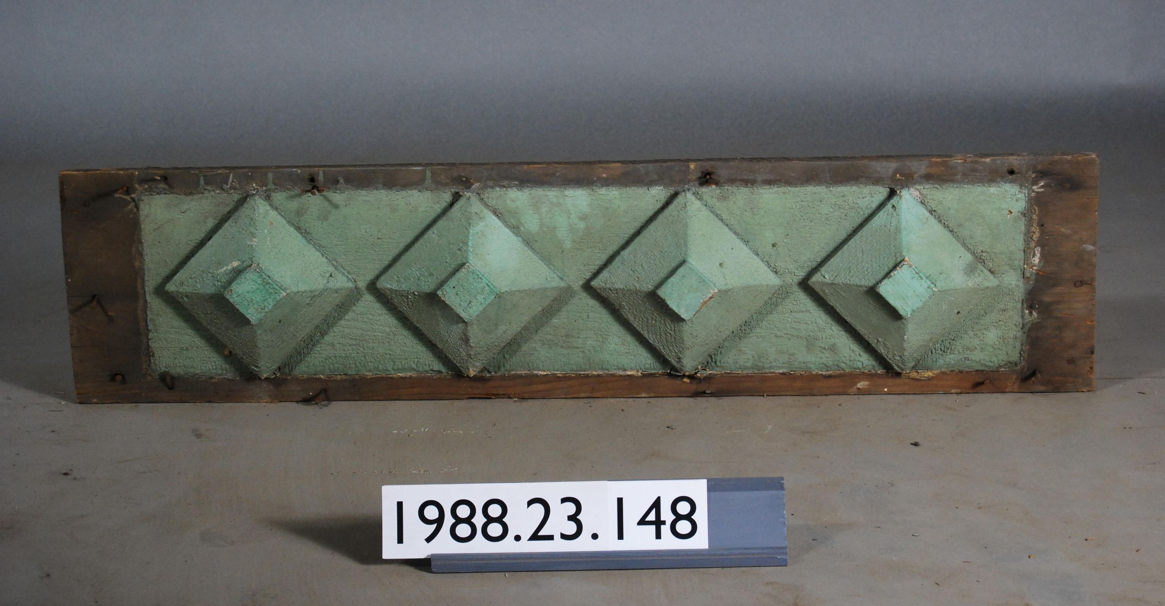 Exterior wood panel. Single board with series of four equi-distant square applied ornaments. Painted green. Manufacturer: Place of Manufacturer: Design motif: Style: Finish: Painted