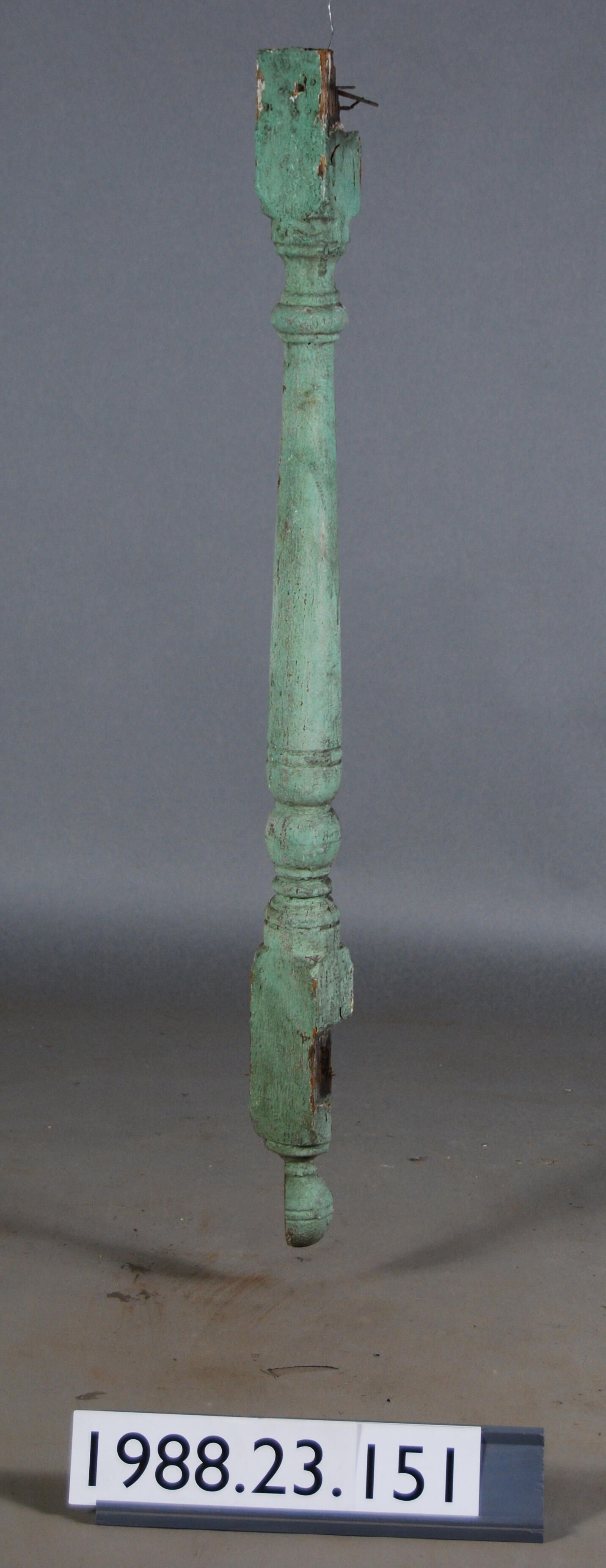 Exterior wood. One turned baluster (?). Incomplete finial (or drop) at one end. Painted green. Manufacturer: Place of Manufacturer: Design motif: Style: Finish: Painted