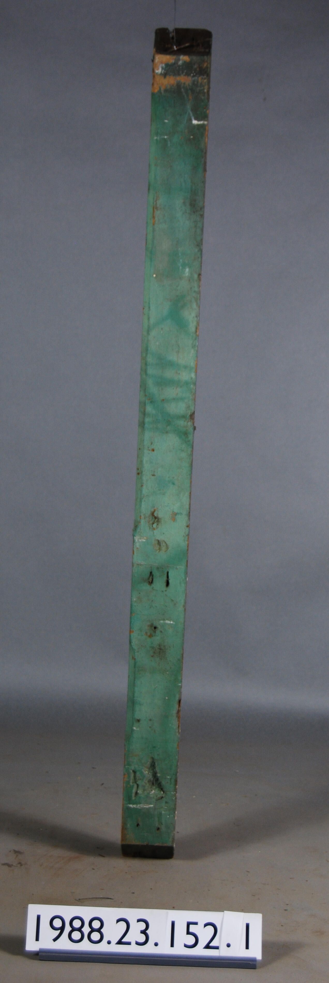 Exterior wood. Brace (?) of undetermined function. Stop chamfered on one edge. 45 degree angle cut on each end. Painted green. Manufacturer: Place of Manufacturer: Design motif: Style: Finish: Painted