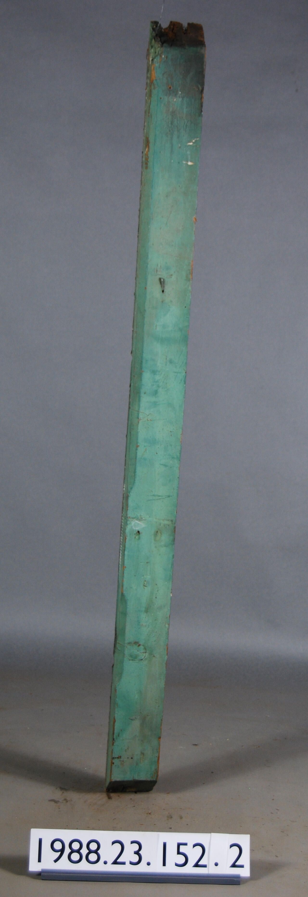 Exterior wood. Brace (?) of undetermined function. Stop chamfered on one edge. 45 degree angle cut on each end. Painted green. Manufacturer: Place of Manufacturer: Design motif: Style: Finish: Painted