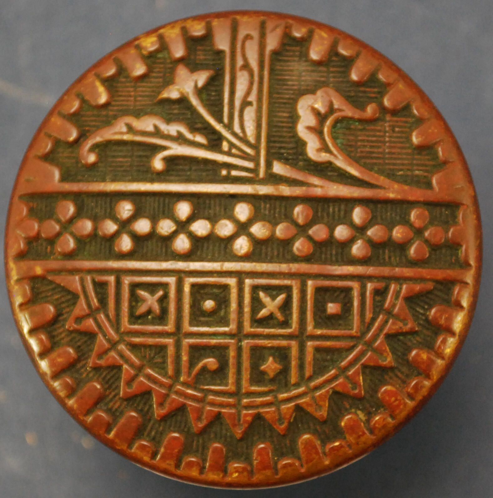 Design Name: Manufacturer: Sargent & Co. Style: Aesthetic Material: Bronze Manufacturing Method: Cast Surface Finish: Aged / Unpolished VDA Classification: Asymmetic VDA Number: B-104 Shape: Drum Patent Specifics: Lock Type (If Applicable): Inscription/Makers Mark: Inscription Text: Comments:
