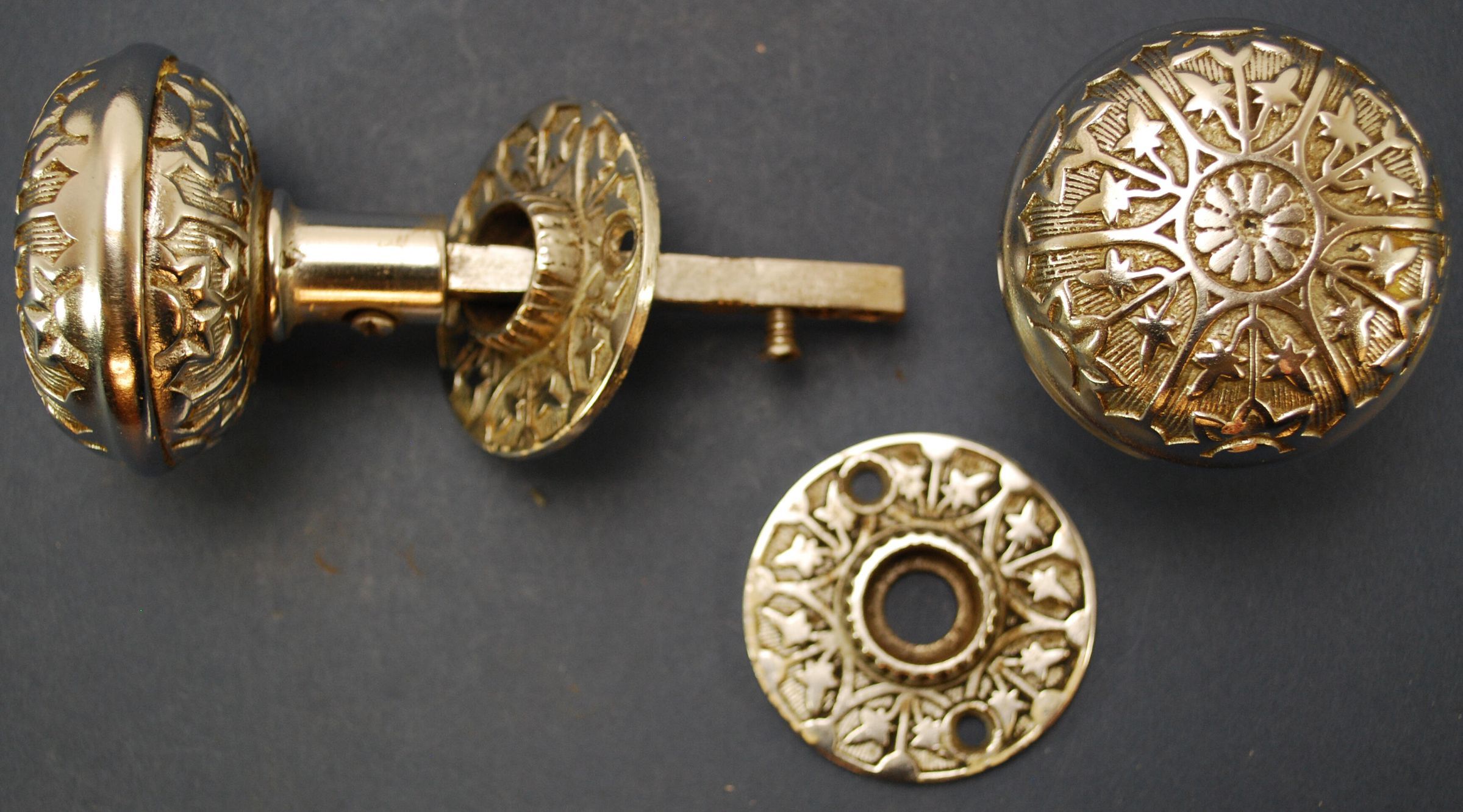 Comments: Chrome plating highly questionable - not solid white bronze as Maud says. Apparently plated later. Includes two doorknobs and two roses.Lexicon