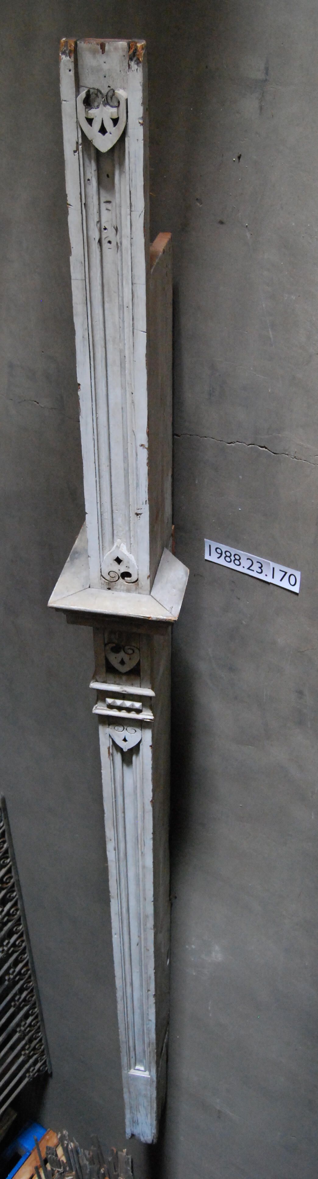 Exterior wood post. Hollow box construction. Narrow recessed panel on front. Has series of applied moldings and fret-work ornaments with botanical motif. Painted white.